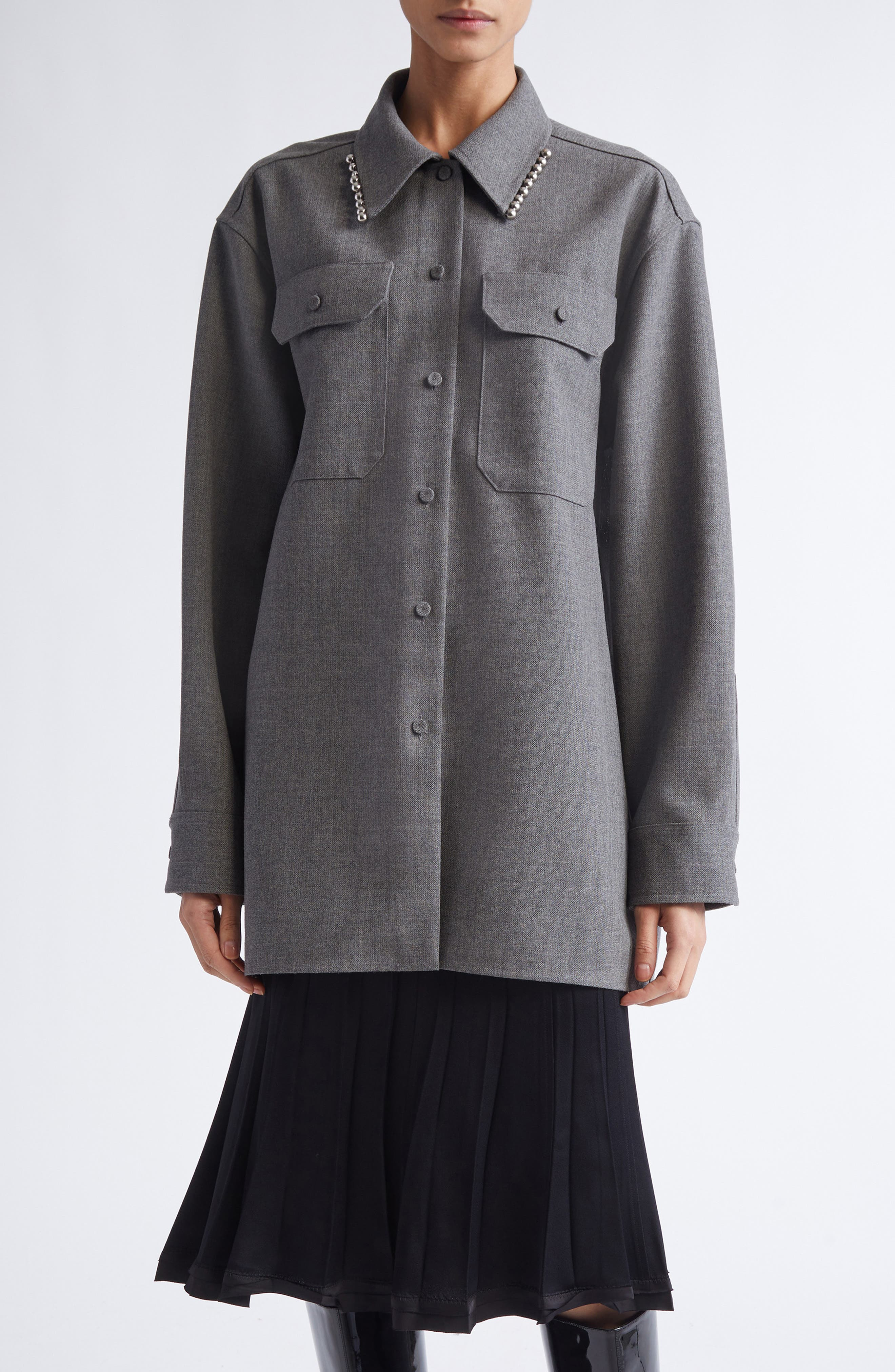 Utility sets the tone through sturdy wool canvas and an easy relaxed cut, then the reveal arrives as metal beads punctuate the collar with calibrated sparkle that carries the piece from field-minded to after-dark. Front button closure Point collar Long sleeves with button cuffs Chest button-flap patch pockets Dropped shoulders 100% wool Dry clean Made in Italy Designer Clothing