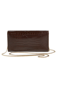 A geometric flap edged with polished hardware enhances the sleek, clean-lined silhouette of this clutch that's made in Italy from glossy, croc-embossed calfskin leather. Magnetic-snap flap closure Removable chain strap Interior zip pocket; six card slots Leather Made in Italy Designer Shoes