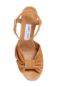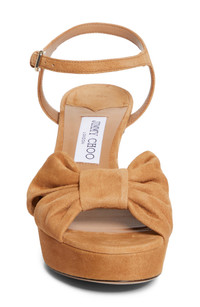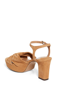 The label's signature sandal is updated in biscuit-colored goatskin suede with the same knotted vamp and bold block heel. 3 3/4" (95mm) heel; 1" platform; 2 3/4" slope (size 38.5) Adjustable ankle strap with buckle closure Leather upper, lining and sole Made in Italy Designer Shoes