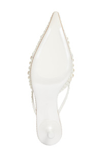 A logo-branded bauble highlights the pointy toe of this strappy satin mule covered with pearly embellishments and balanced on a signature drop heel. 2" (50mm) heel Textile upper/leather lining and sole Made in Italy Designer Shoes