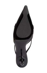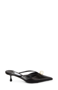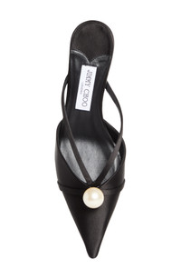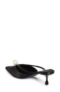 A logo-embellished pearly bauble highlights the pointy toe of this strappy satin mule balanced on a signature drop heel. 2" (50mm) heel Textile upper/leather lining and sole Made in Italy Designer Shoes