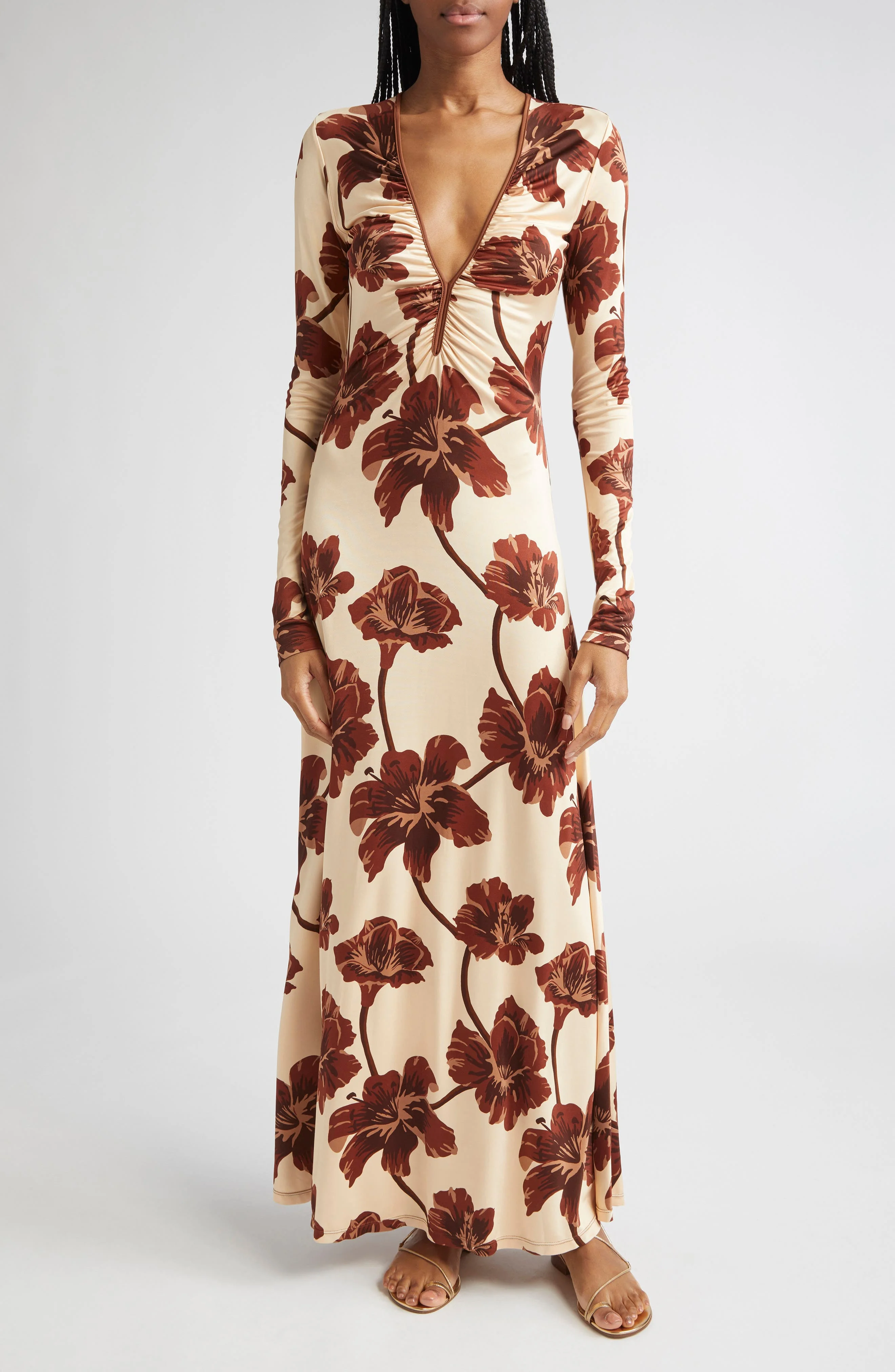 Johanna Ortiz Alma Bordada Floral Print Long Sleeve Jersey Dress in Ecru /Chocolate /Mocca at Nordst