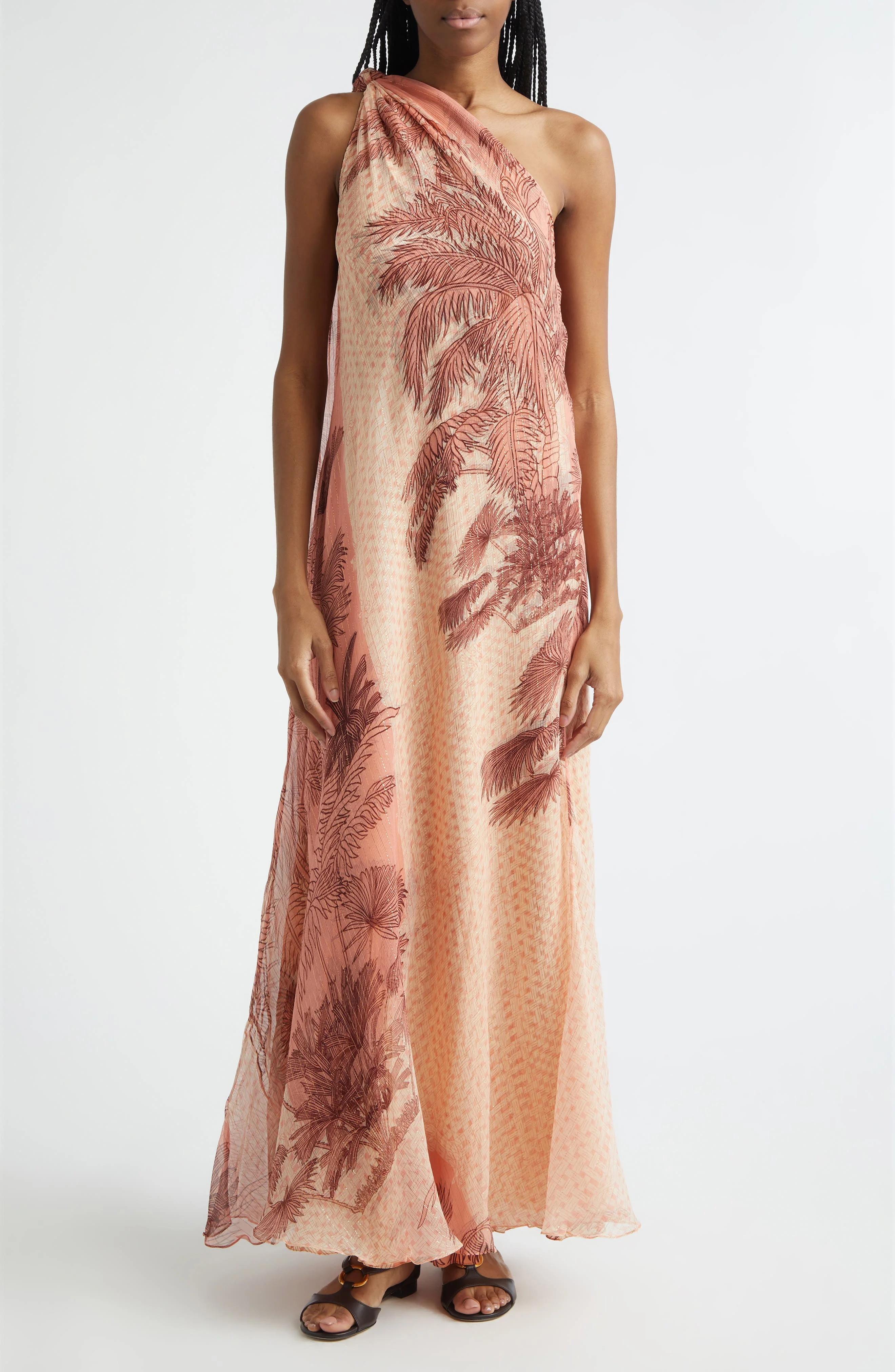 Johanna Ortiz Freedom Palm Print Metallic Silk Crêpe de Chine Maxi Dress in Ecru /Peach at Nordstrom