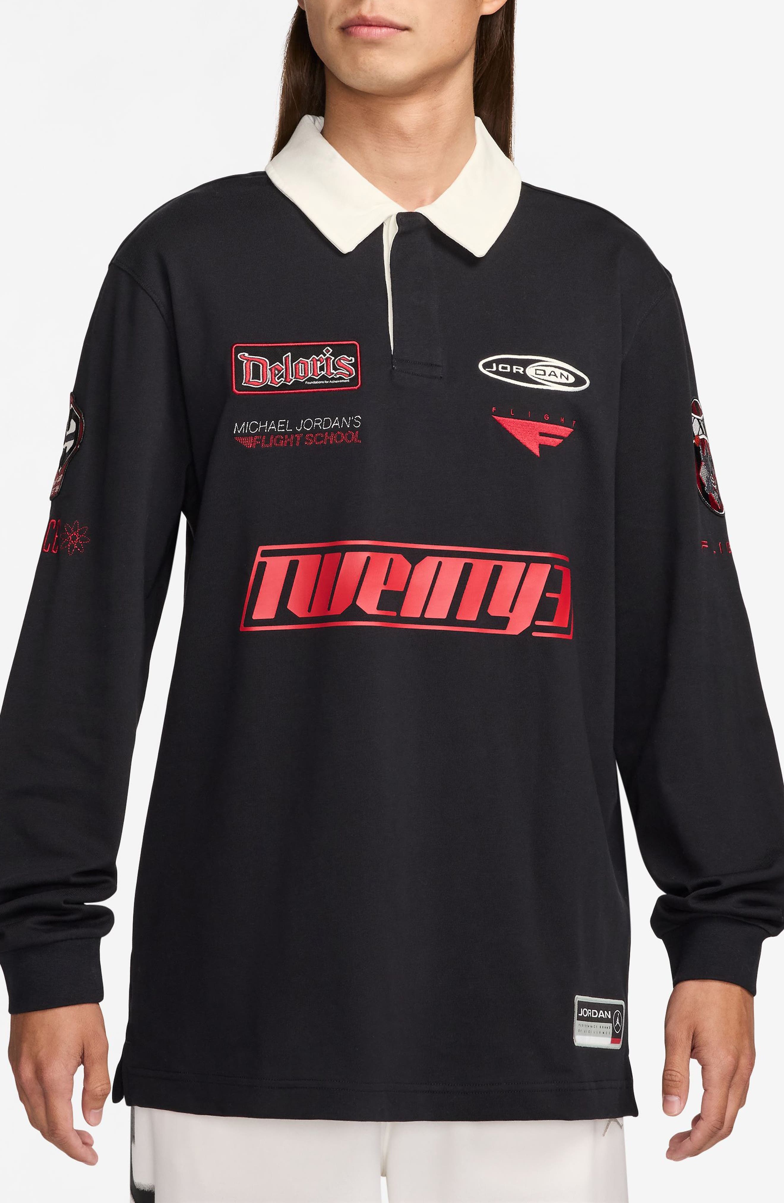 Jordan-inspired logos and patches bring game-winning energy to a rugby shirt that's made of soft cotton and sized with plenty of room to play or relax. Hidden-button half placket Spread collar Long sleeves with banded cuffs 100% cotton Machine wash, dry flat Imported Nordstrom x Nike: A curated lifestyle destination where fashion is the ultimate sport