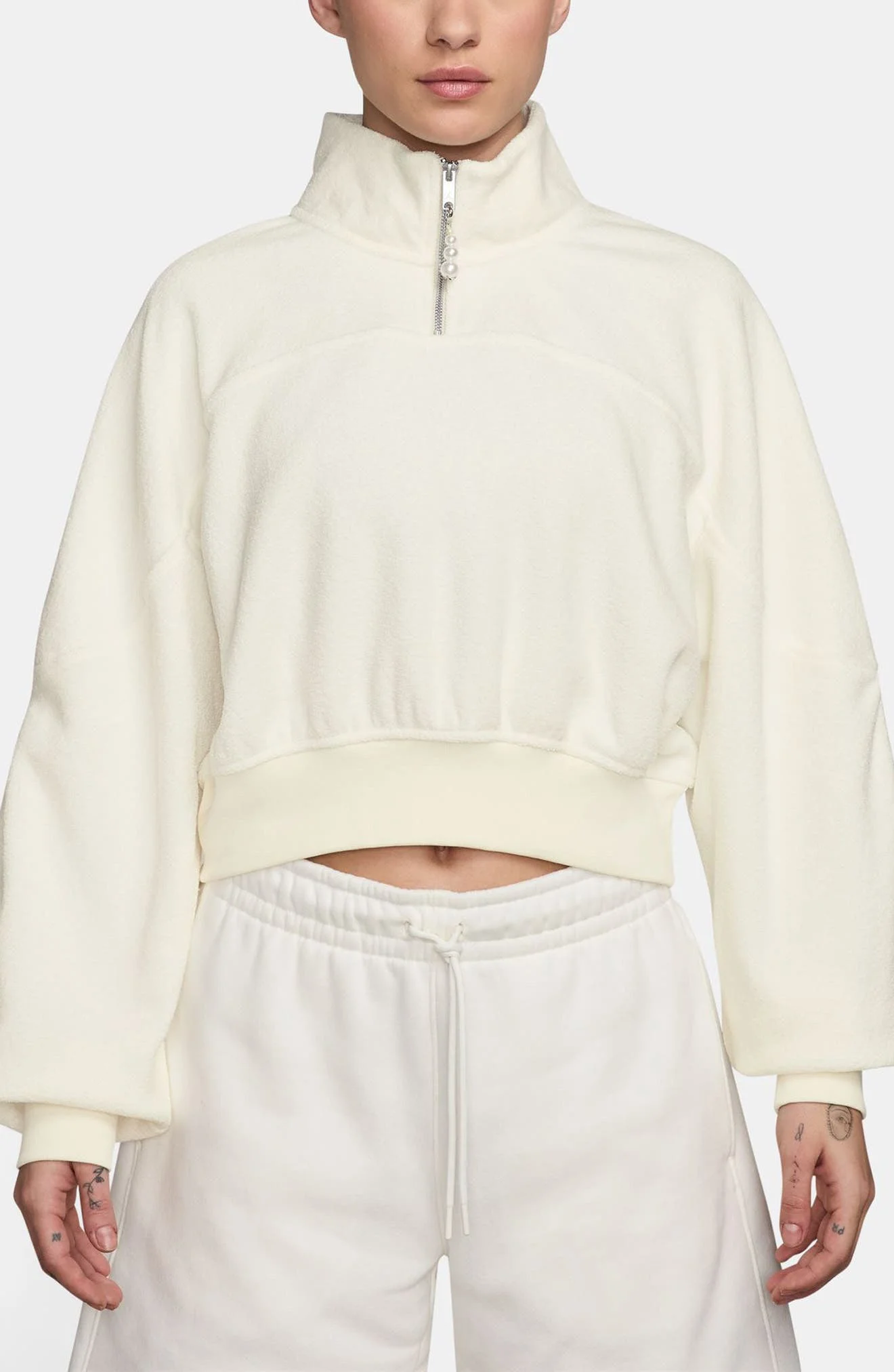 Looped French terry and a slouchy, cropped fit offer ultimate comfort in this quarter-zip pullover you'll love wearing on and off the court. Faux pearls tip the zip pull for an element of polished juxtaposition. Quarter-zip closure Stand collar Ribbed cuffs and hem 50% cotton, 50% polyester Machine wash, dry flat Imported Nordstrom x Nike: A curated lifestyle destination where fashion is the ultimate sport