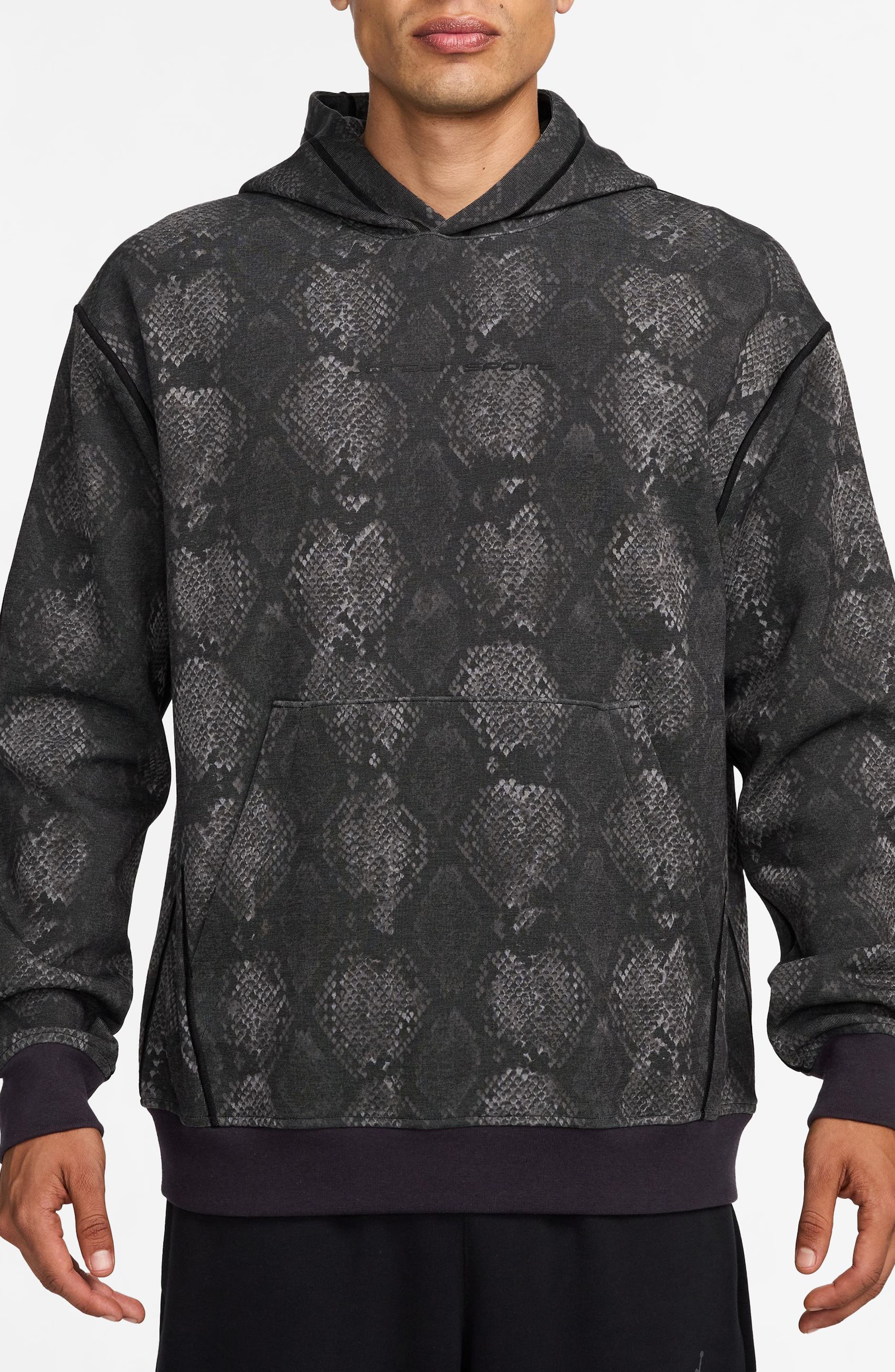 Turn your hoodie collection on its head with the reptillian pattern of this style that's still got all the quick-drying Dri-FIT tech you depend on to keep your workout comfortable as you go hard. 26 1/2" length (size Medium) Fixed hood Kangaroo pocket Ribbed cuffs and hem Dri-FIT moisture-wicking technology 69% cotton, 31% polyester Machine wash, tumble dry Imported Nordstrom x Nike: A curated lifestyle destination where fashion is the ultimate sport