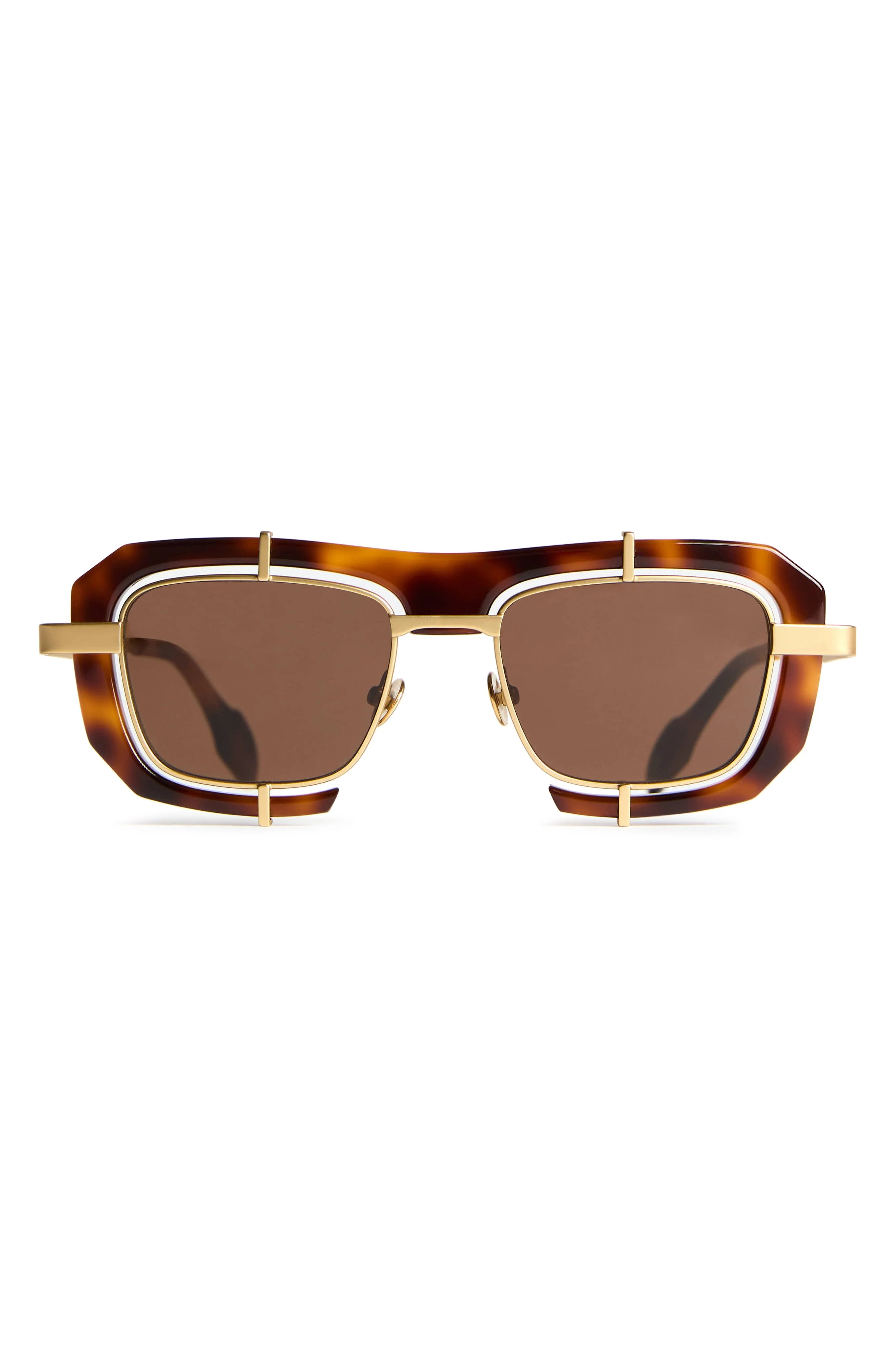 These geometric sunglasses make a bold statement with golden metallic frames surrounded by a thick outline of tortoiseshell-patterned acetate. 100% UV protection Adjustable nonslip nose pads Acetate/metal Imported