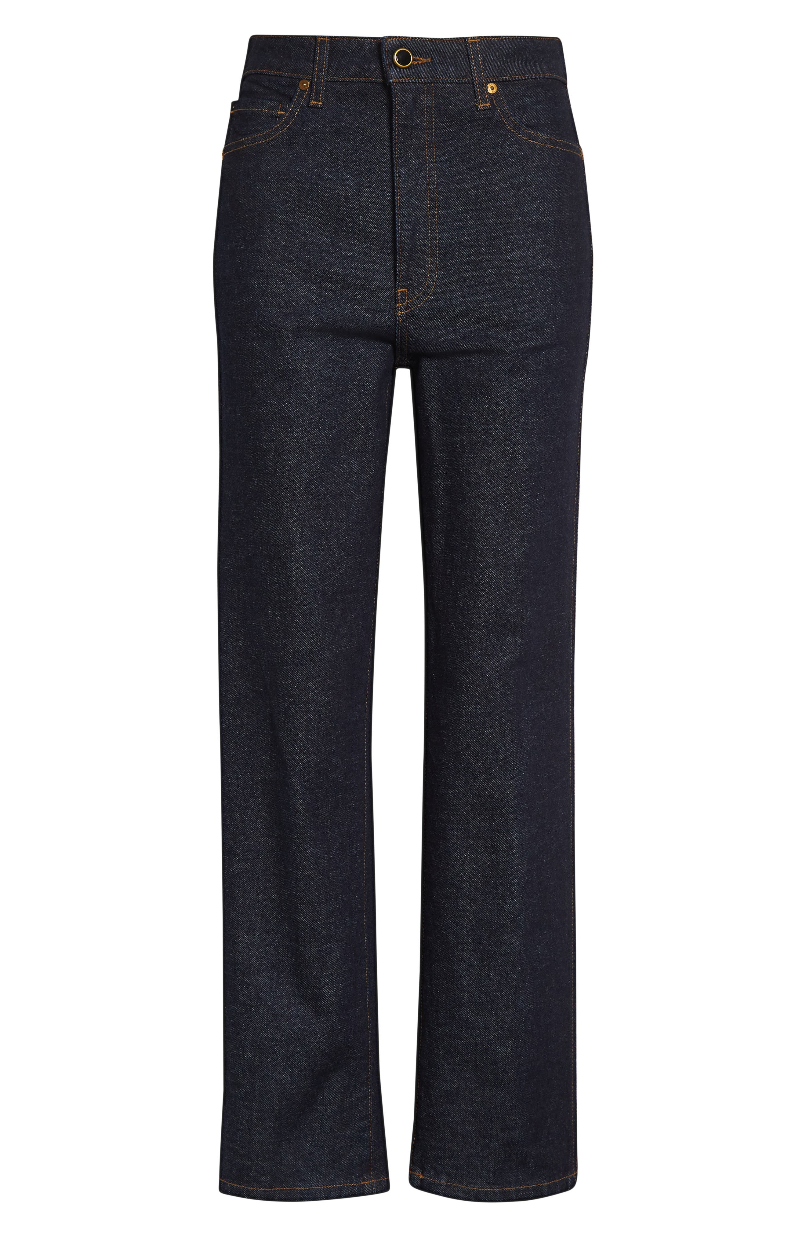 Low-stretch denim in a dark blue wash with classic marigold topstitching brings retro vibes to these USA-made jeans cut in a straight-leg silhouette. Zip fly with button closure Five-pocket style 98% cotton, 2% polyurethane Dry clean Made in the USA Designer Clothing
