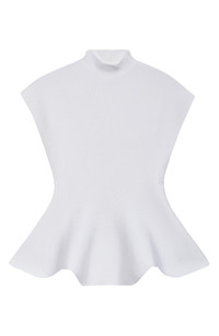 Uniquely shaped from a lustrous viscose blend, this knit top is formed with dolman cap sleeve and an undulating peplum for a soft yet standout silhouette. Hidden side-zip closure Mock neck Cap sleeves 66% viscose, 31% polyamide, 3% elastane Dry clean Made in Italy Designer Clothing
