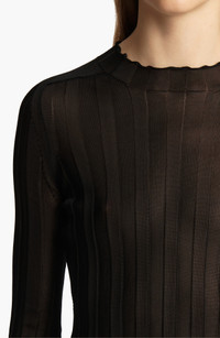 Wide-set ribbing conceals and reveals to alluring effect on this figure-skimming top from Catherine Holstein's roster of coveted knits—lauded by fashion insiders since the New York label's debut. Lettuce-edge trim sweetens the look. Mock neck Long sleeves Sheer 99% viscose, 1% polyamide Dry clean Made in Italy Designer Clothing