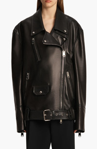 Featured in her spring '25 runway presentation, this biker jacket made from textured lambskin leather features extended sleeves and the oversized silhouette Holstein has long favored in her outerwear designs. Asymmetric two-way zip closure Notched collar Zip cuffs Chest zip pocket; front zip pockets; snap-flap pocket Removable belt