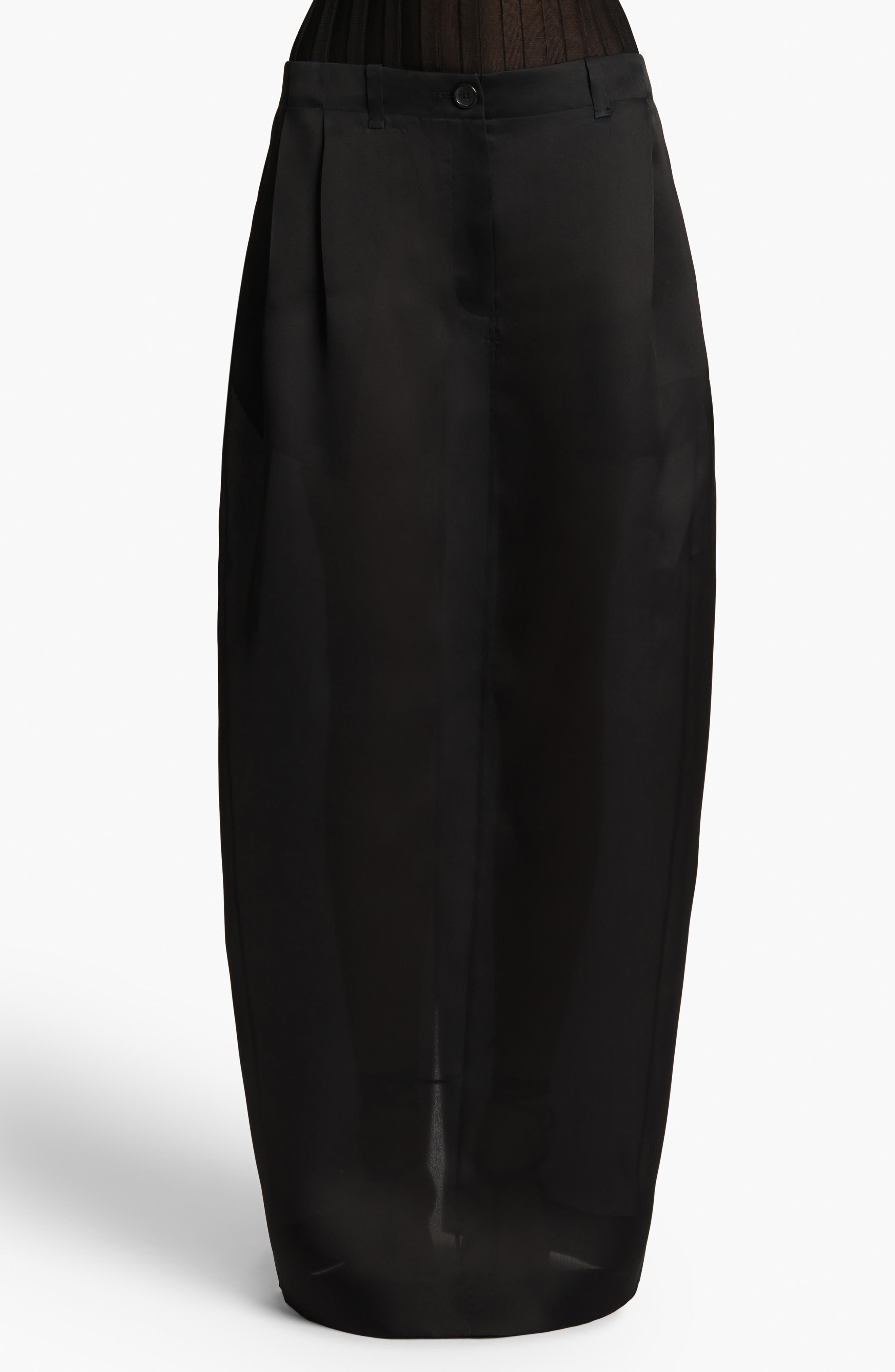 Semisheer silk organza and pleats at the waist help structure the sculptural shape of this runway-featured maxi skirt that takes cues from classic trouser tailoring. Zip fly with button closure Side-seam pockets; back welt-patch pockets Back slit 100% silk Dry clean Made in the USA Designer Clothing