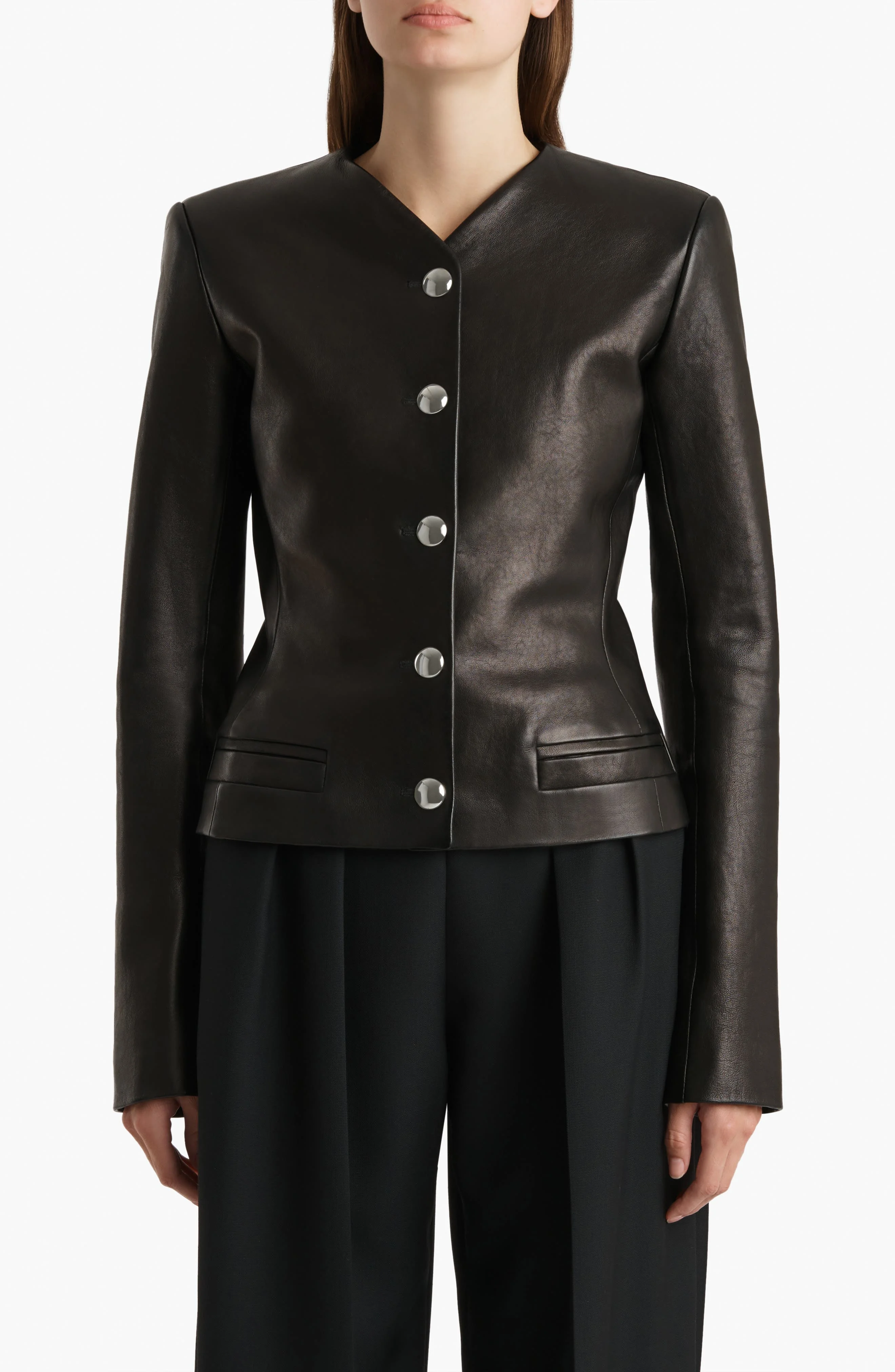 Catherine Holstein distills the strength and simplicity of '90s minimalism in this collarless sleek lambskin-leather jacket with reinforced shoulder pads and a sculpted hourglass cut that echo the era's power suiting. Front button closure V-neck Four-button cuffs Faux pockets Cupro lining Leather Professional leather clean Made in the USA Designer Clothing