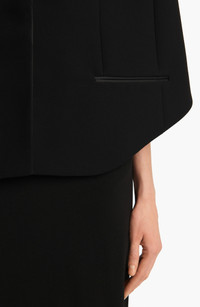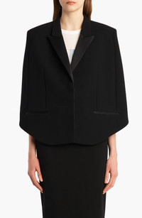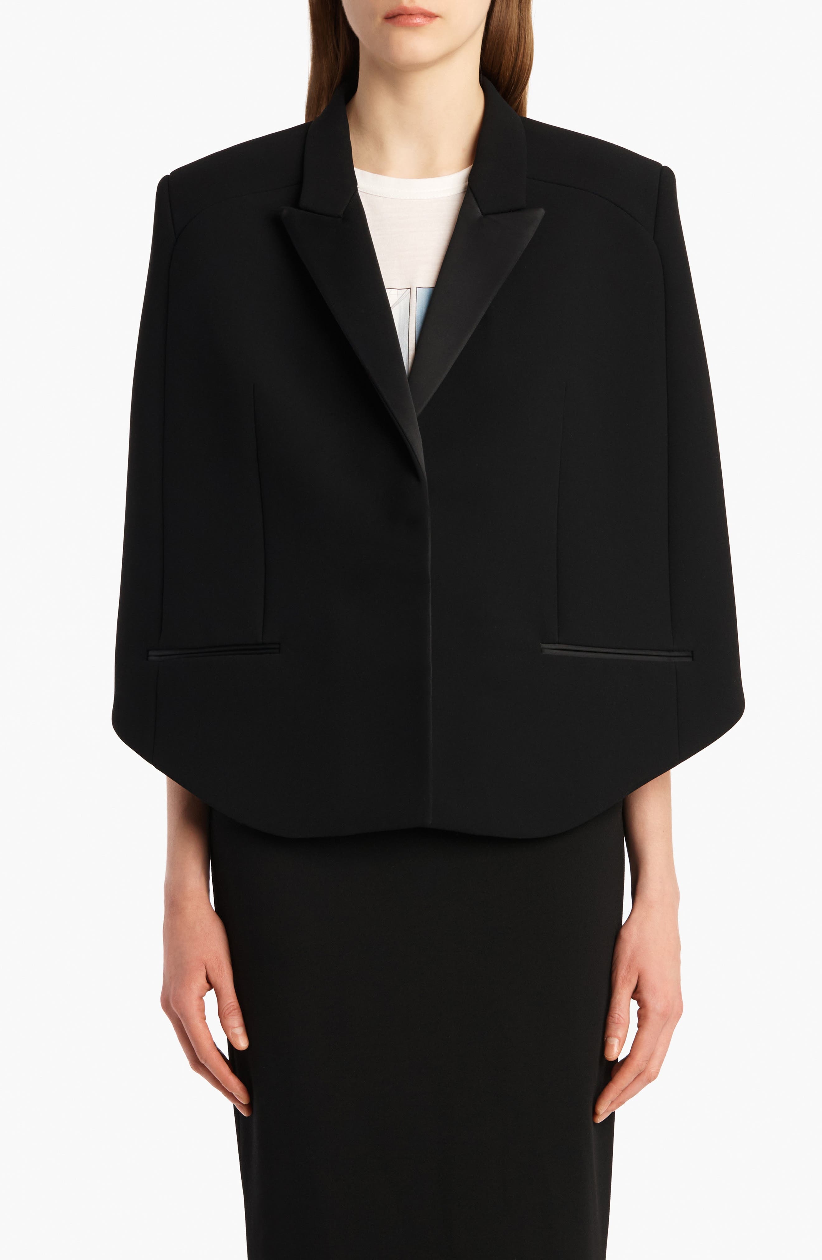 For pre-fall '25, Catherine Holstein continues her contemplation of power dressing from the '80s and '90s, teaming texture and shape to dramatic effect in this rounded, bold-shouldered cape cut from smooth double-face crepe set against glossy satin trim. Peaked lapels Three-quarter sleeves Front welt pockets Lined 100% polyester Dry clean Made in the USA Designer Clothing