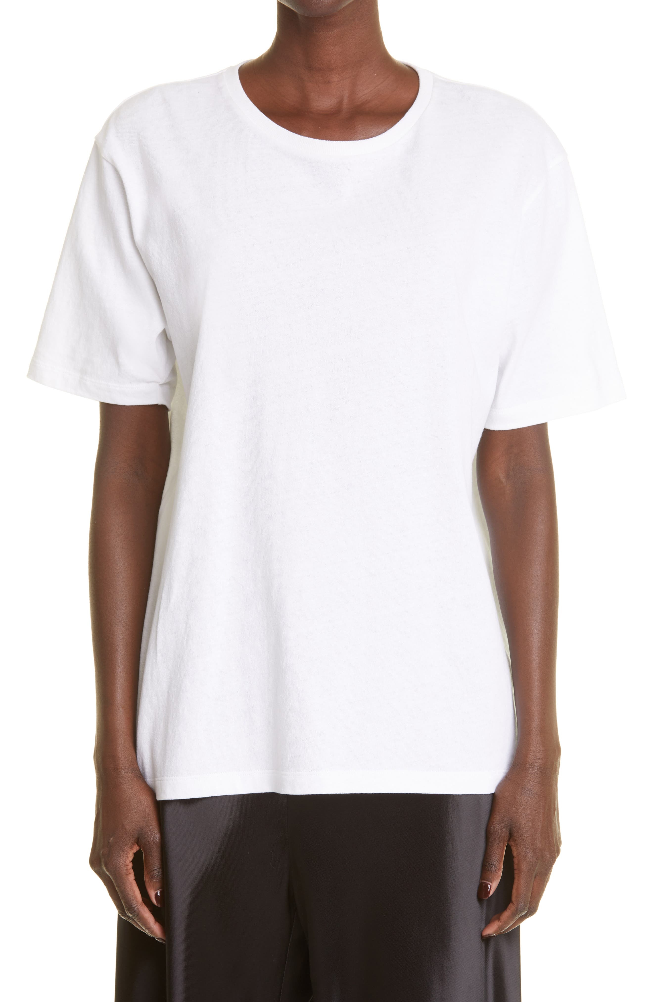 A classic boxy-fit T-shirt is elevated in an extrasoft cotton jersey knit. 26" length (size Medium) Crewneck Short sleeves 100% cotton Machine wash, dry flat Made in Portugal Women's Designer Clothing