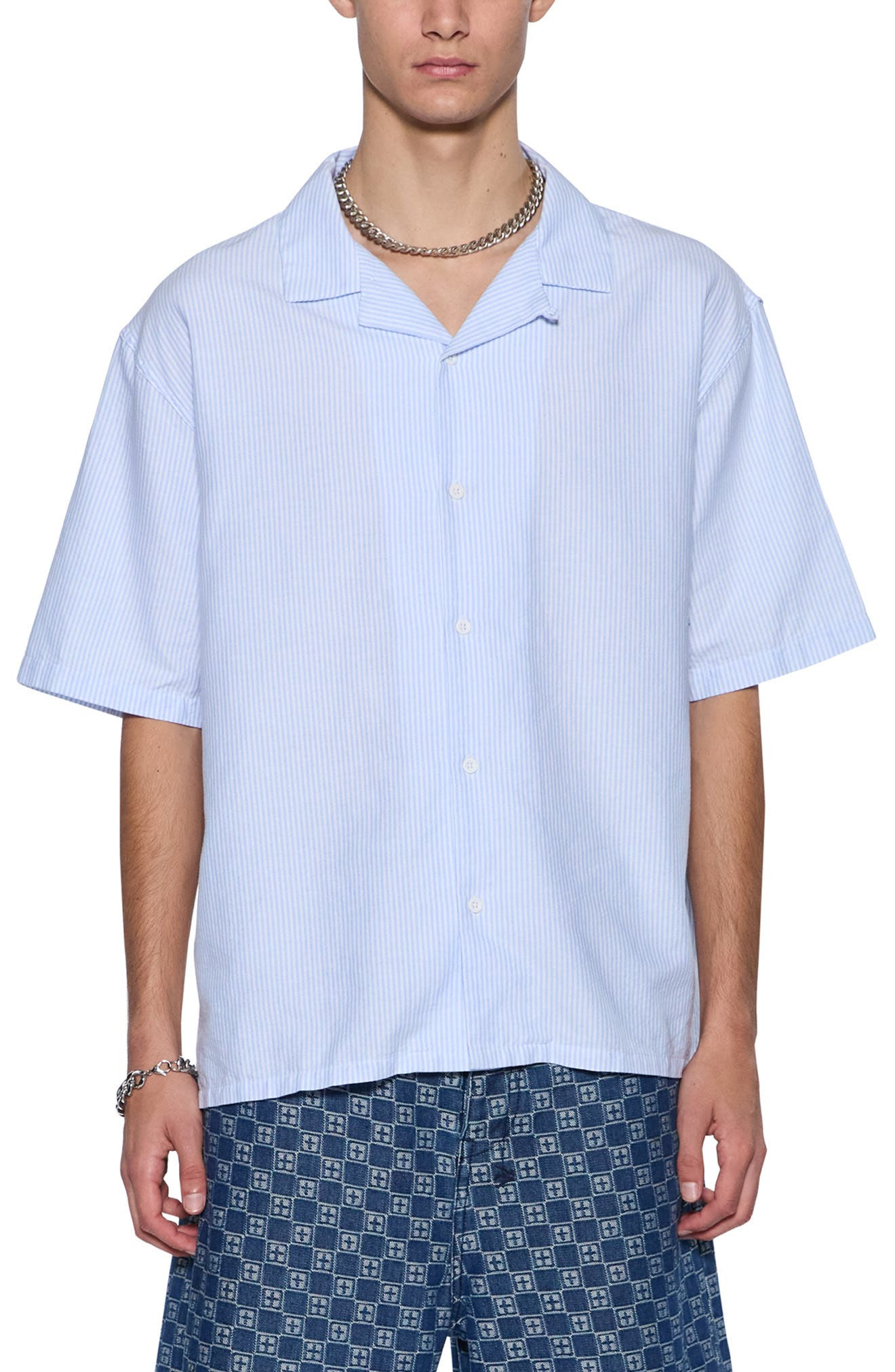 Ksubi Embroidered Caring Diner Tru Stripe Organic Cotton Camp Shirt in Blue at Nordstrom