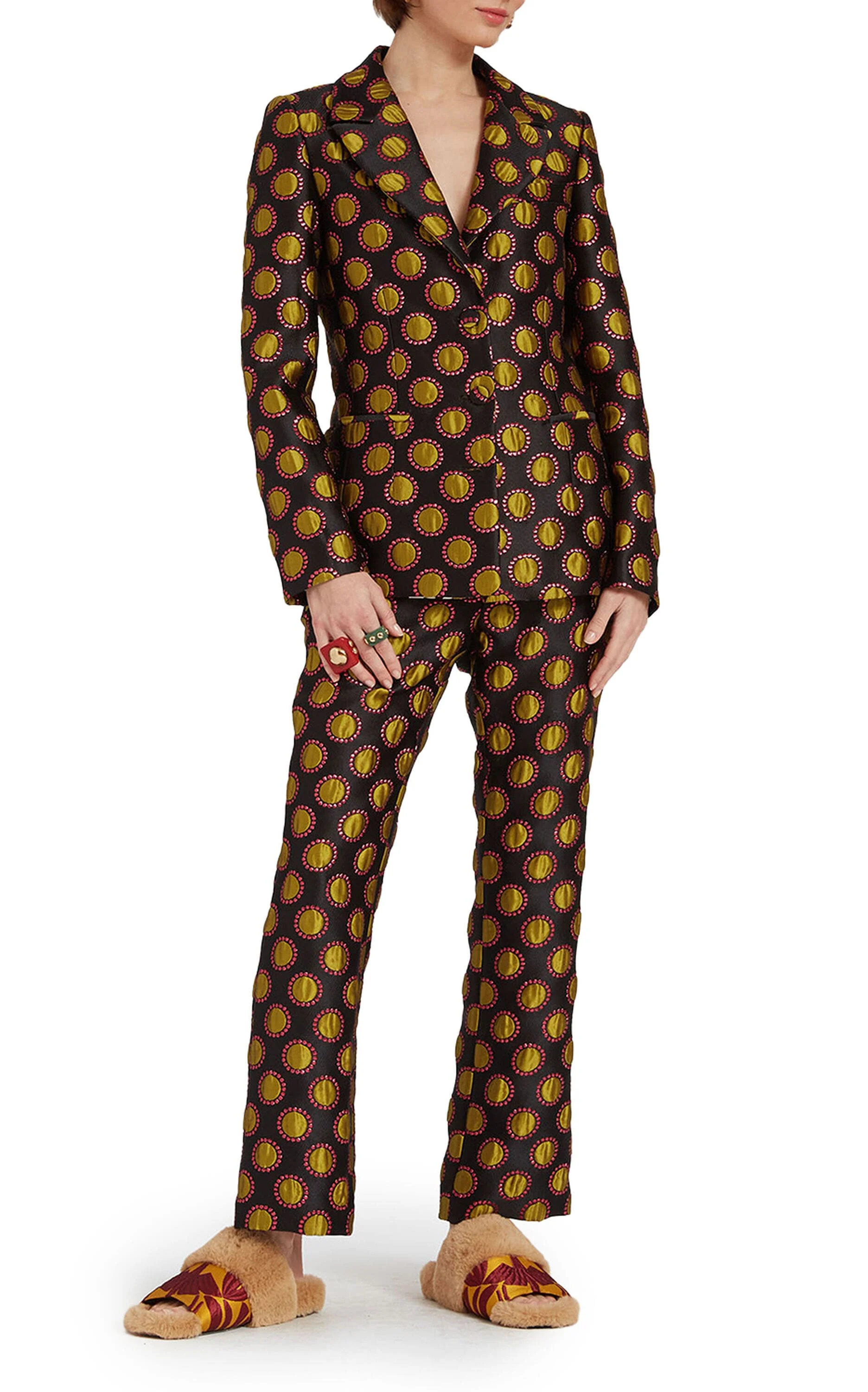 a€‹a€‹If the next Bond is a woman, she's wearing this blazer. An updated take on a seventies silhouette, the 24/7 Jacket has a structured shoulder and slightly tapered waist for a fiercely flattering fit. Done in this dazzling Ruby brocade with the 24/7 Pants to match, this totally dynamite piece will elevate anything you put it with. Even sweat pants. Promise. Jacquard Large Pockets on the Lapel Contrast Lining Faux Horn Buttons 100% Made in Italy Composition: 80% Polyester 9% Metal 7% Silk 4% Polyamide The model is 179 cm tall and wears a size S Garment length: 65cm