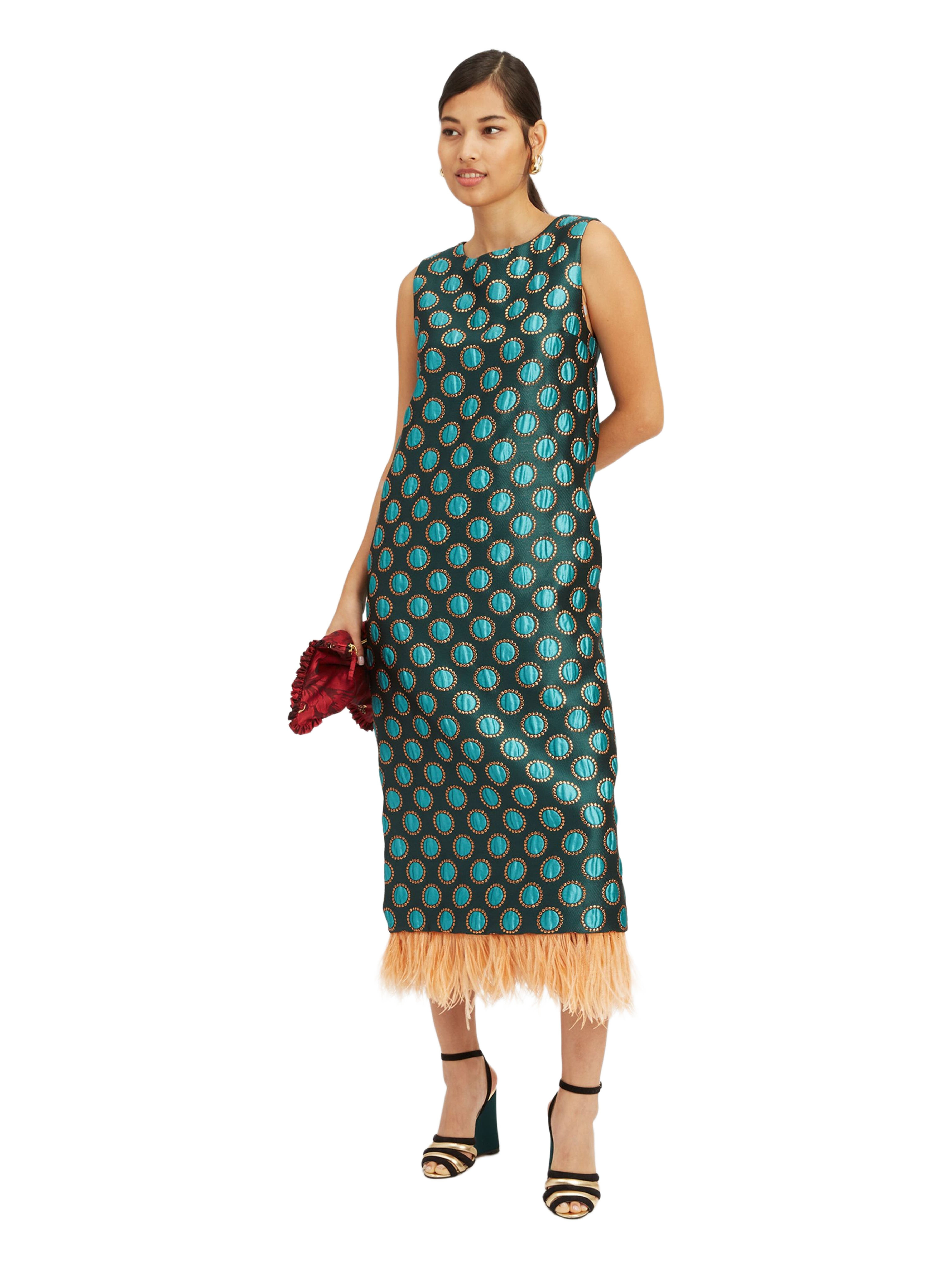 Need a boost? Skip the ginger shot and head straight for this stunner. All about giving you a kick in the happy pants, the Column Dress is a total delight for the senses crafted in textured jacquard and finished with a fabulous contrast feather trim. Its straight column shape doesn’t cling and is friendly on all figures, while a slit in the floor-length skirt (at the back) means it’s still good for shimmying. Crafted in this Winter Sun motif for an uniquely elegant finish. Jacquard Round neck Sleeveless Column shape Maxi length Slit at back 100% Made in Italy Composition: 78% Polyester 9% Metal 7% Silk 4% Polyamide 2% Ostrich Feathers The model is 5'10.5" tall and wears a size S Garment length: 45.3"