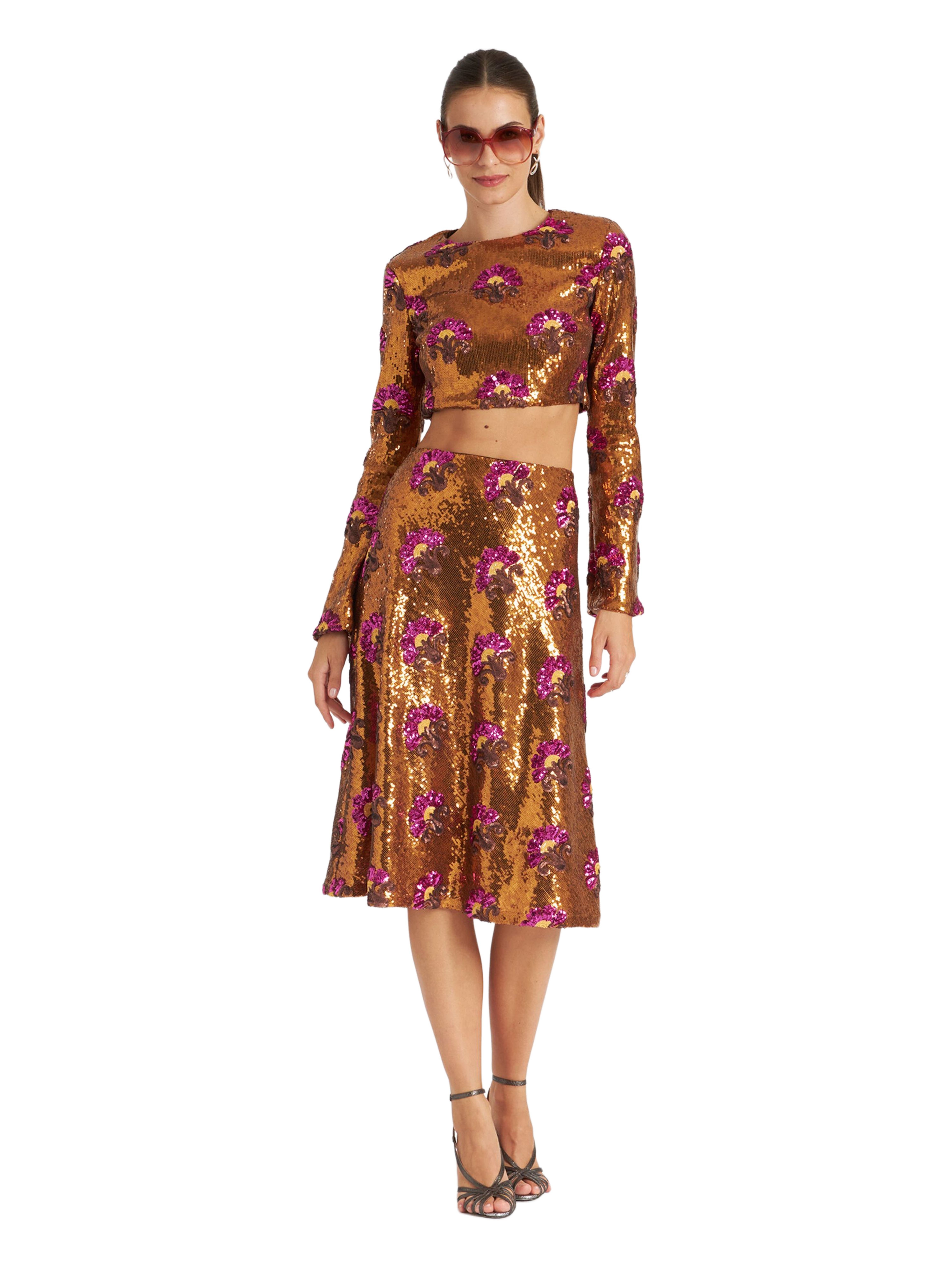 We could have called this super-chic crop top “The Holly-day” as she’ll no doubt be the protagonist in your party wear wardrobe this season. A romantic trumpet sleeve that flares from the elbow adds romance to the classic crew neck shape, which hits high on the waist for a leg-lengthening effect. Arriving in exquisite shimmering bronze and magenta sequins, this piece oozes elegance and opulence, perfect with the matching Holly Skirt for a holiday festa, or with a Pencil Skirt for a luxurious date night. Zipper in the back Trumpet sleeve Sequined Crop at waist Composition: 99% Polyester 1% Elastane Made in Italy The model is 5'10" tall and wears a size S Garment length: 15"