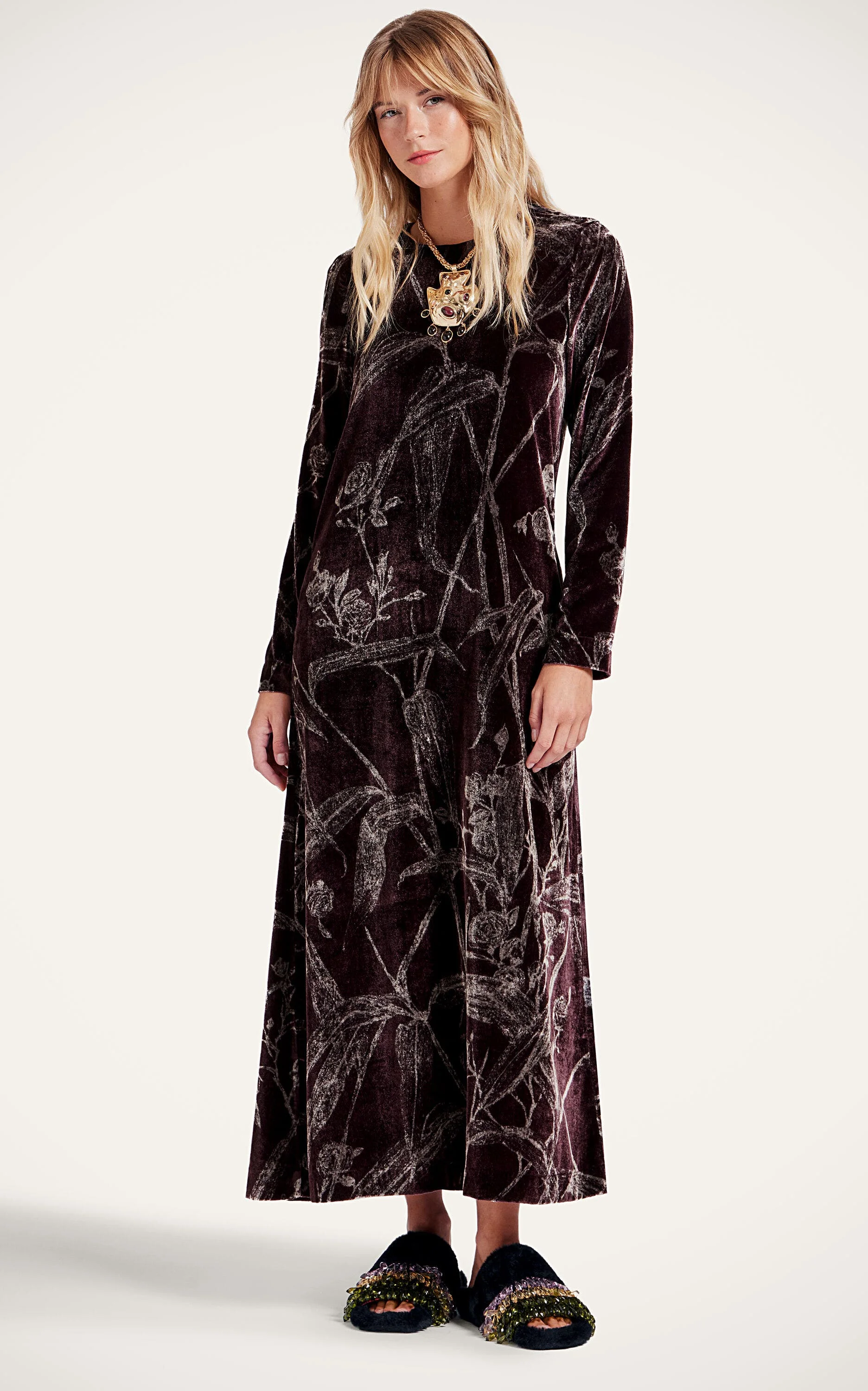 It's the Swing Dress you know and love, but with long sleeves, babe! This design twist on our very first La DoubleJ dress provides a very practical update for our best-seller. Crafted with hidden pockets and a generous cut through the hips that falls to an ankle-swinging skirt. Done in delicious Italian devoree with a hint of stretch (for daytime, dancing - you name it), a full body mood-booster in this print in beautiful burgundy that'll turn heads in your stride. Hey, we like that. Devoree Slim in the shoulders, generous in the hips Long sleeves Falls into an A-line Hits just above the ankles Hidden side slit pockets Concealed back zipper 100% Made in Italy Composition: 80% Viscose 20% Polyamide Garment length: 135cm