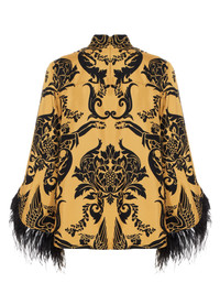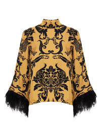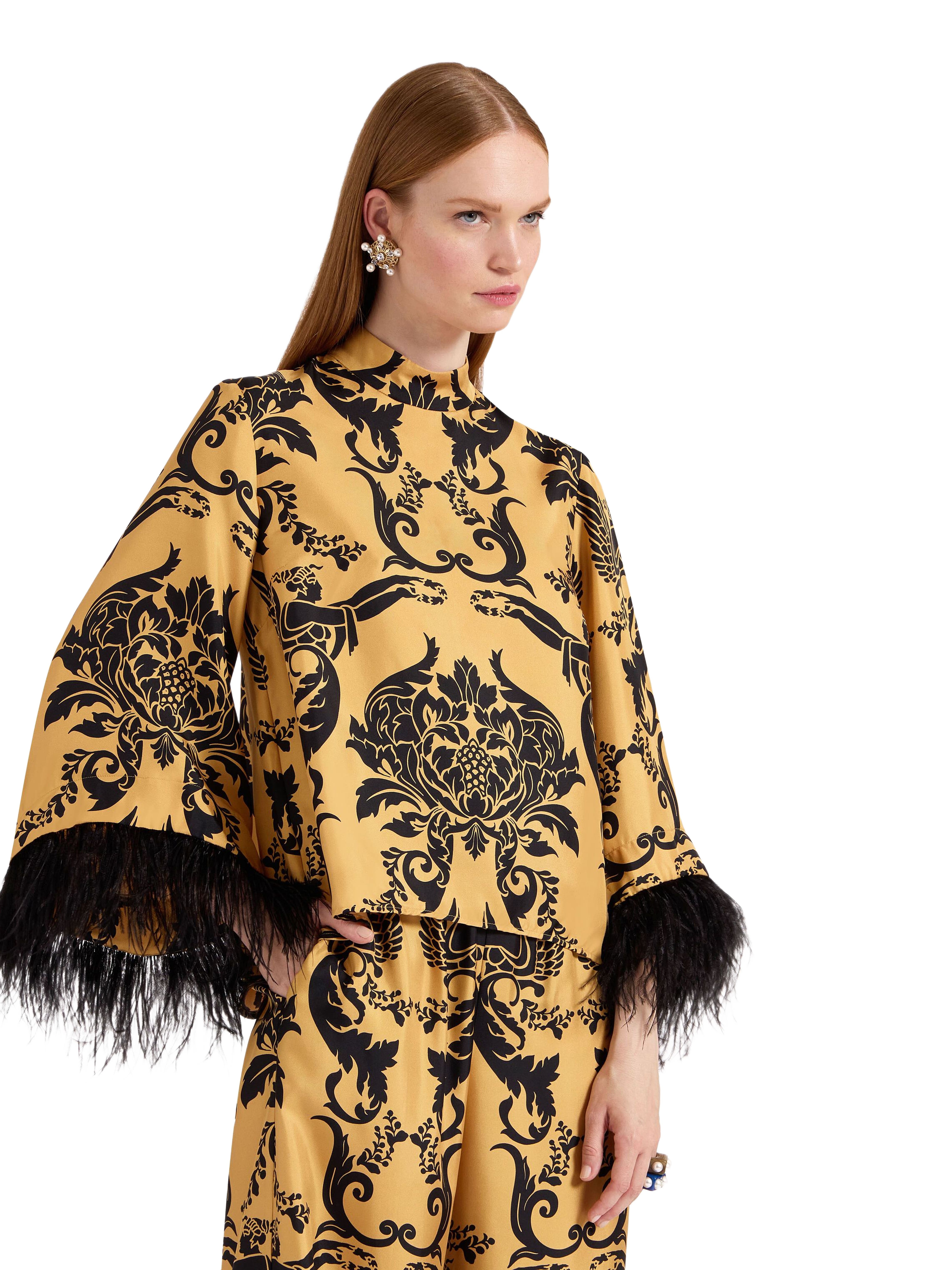 If a top could be a tease, this one would be it. Deceptively demure in the front with a high neck and easy A-line shape through the body, it’s the back of this beauty that truly wows, with a cape-like high-low back that floats as you turn. This silk twill iteration with feather-dipped sleeves has date night drama written all over it. Throw it under a gilet or our Folk Jacket for bohemian flare, or with our Milano Skirt for a super chic silhouette. Silk Feathers on the sleeves High neck A-line shape body Shorter in front, longer in the back 100% Made in Italy Composition: 98% Silk 2% Ostrich Feathers The model is 177 cm / 5′ 9.7″ tall and wears a size S