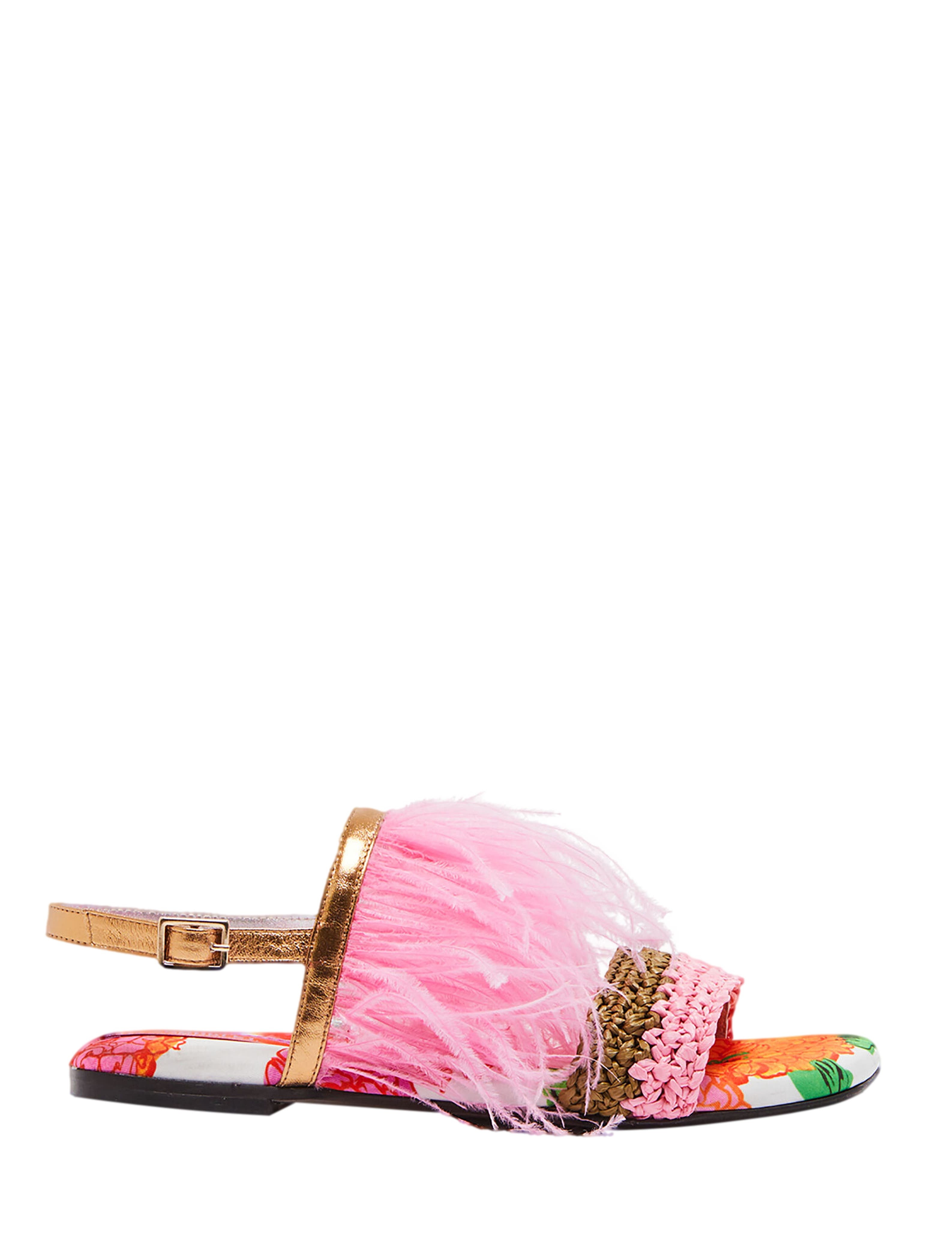 Yup, we took a firework and made a shoe out of it. The Medal Sandal is the perfect blend of luxury Italian craft and laid-back exuberance, arriving with a celebratory plume of ostrich feathers, an intricately woven toe strap, a shimmery metallic leather buckle and printed silk twill base. Wear them with your matching Pull-Up Shorts or Biennale Dress over a bathing suit, or give them the spotlight they deserve with your favorite all-white summer ensemble. Seriously, these babies are like the Fourth of July for your feet. Metallic leather ankle strap Adjustable metal buckle Ostrich feather plume Woven raffia toe strap Printed silk twill footbed Made in Italy