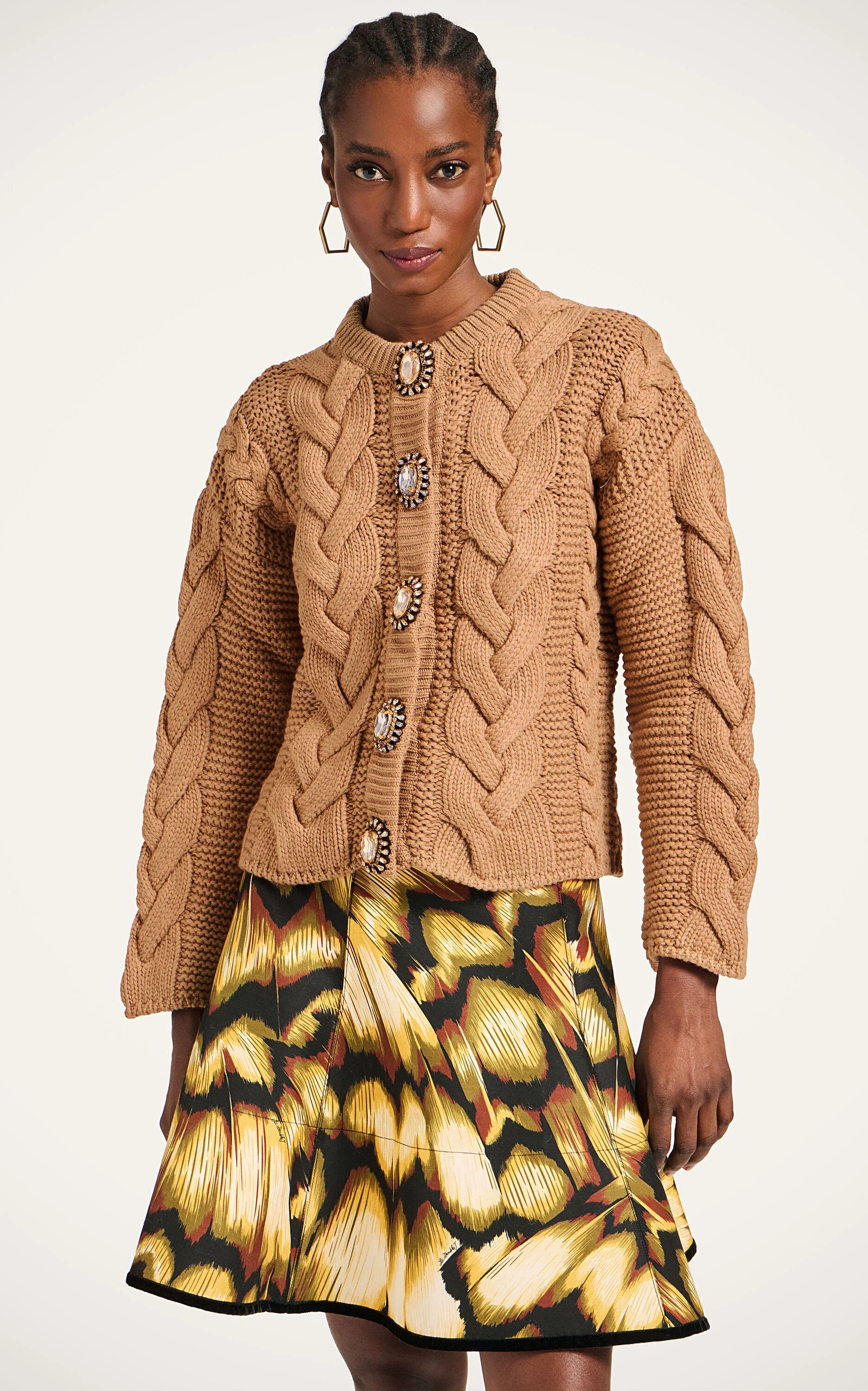 A chunky cropped cardigan crafted from a cashmere blend? Sign us up, sister. With thick braids down the front and sleeves, this extra special statement piece will have you aching for sweater weather even in high summer. Yes, those are extra large gemstones running from top to bottom. In this molto Milanese shade of brown, say hello to Italian opulence. Cropped cardigan Chunky knit braids Gem embellishments 100% Made in Italy Composition: 40% Merino Wool 25% Viscose 25% Nylon 10% Cashmere