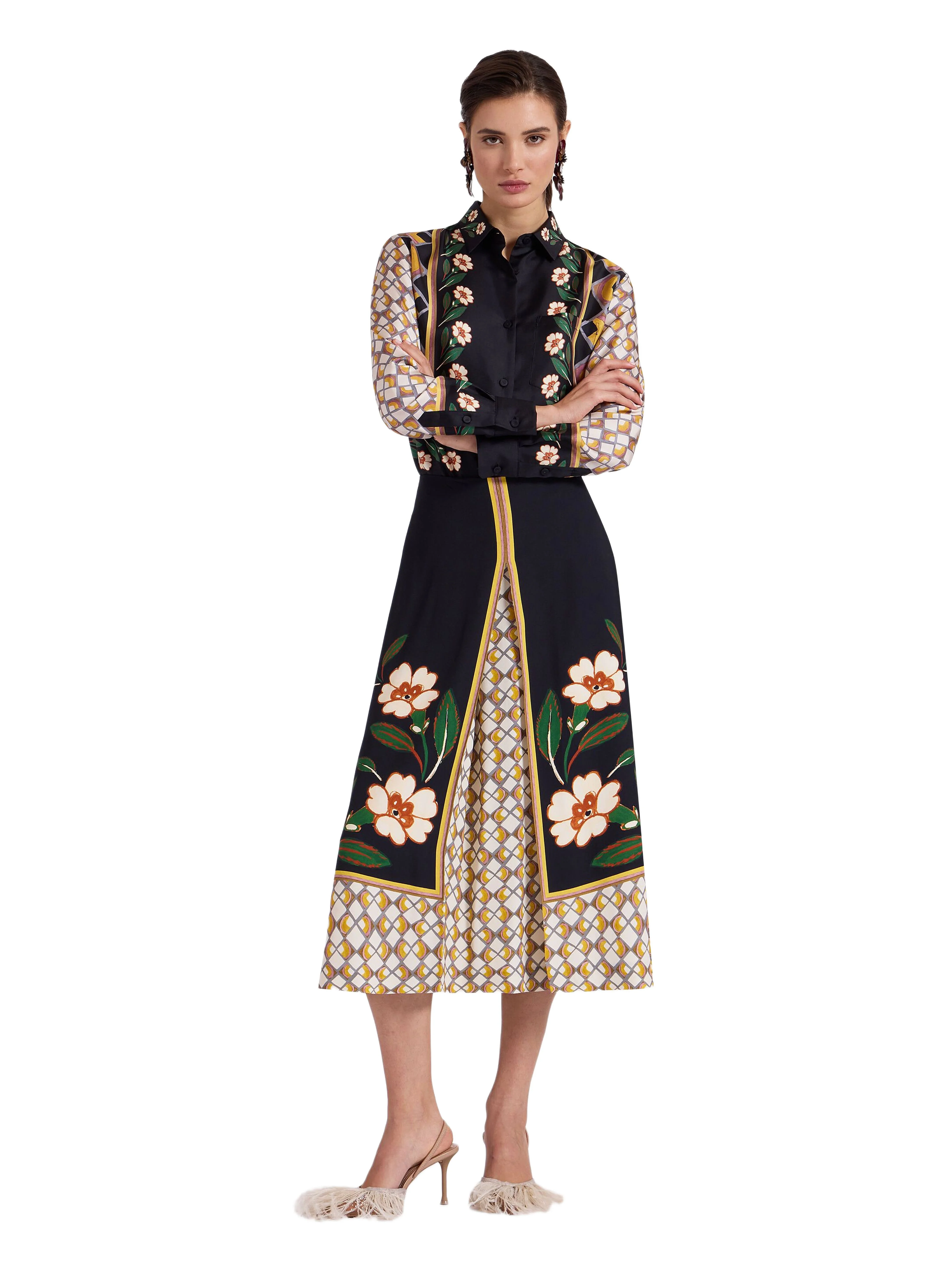 Cut from our super luxurious satin sable, our Santa Monica Skirt is a delight to take for a twirl, particularly in this precisely placed Dazed print. This baby is great worn with heels to pump up the volume, but we like wearing ours with sneakers, a box-fresh white tee and an oversized cardi. Satin sable Fitted at the waist Falls gently into a flared A-line shape Hits mid-calf Inverted front pleat Side zip 100% Made in Italy Composition: 100% viscose The model is 180 cm / 5′ 11″ tall and wears a size S