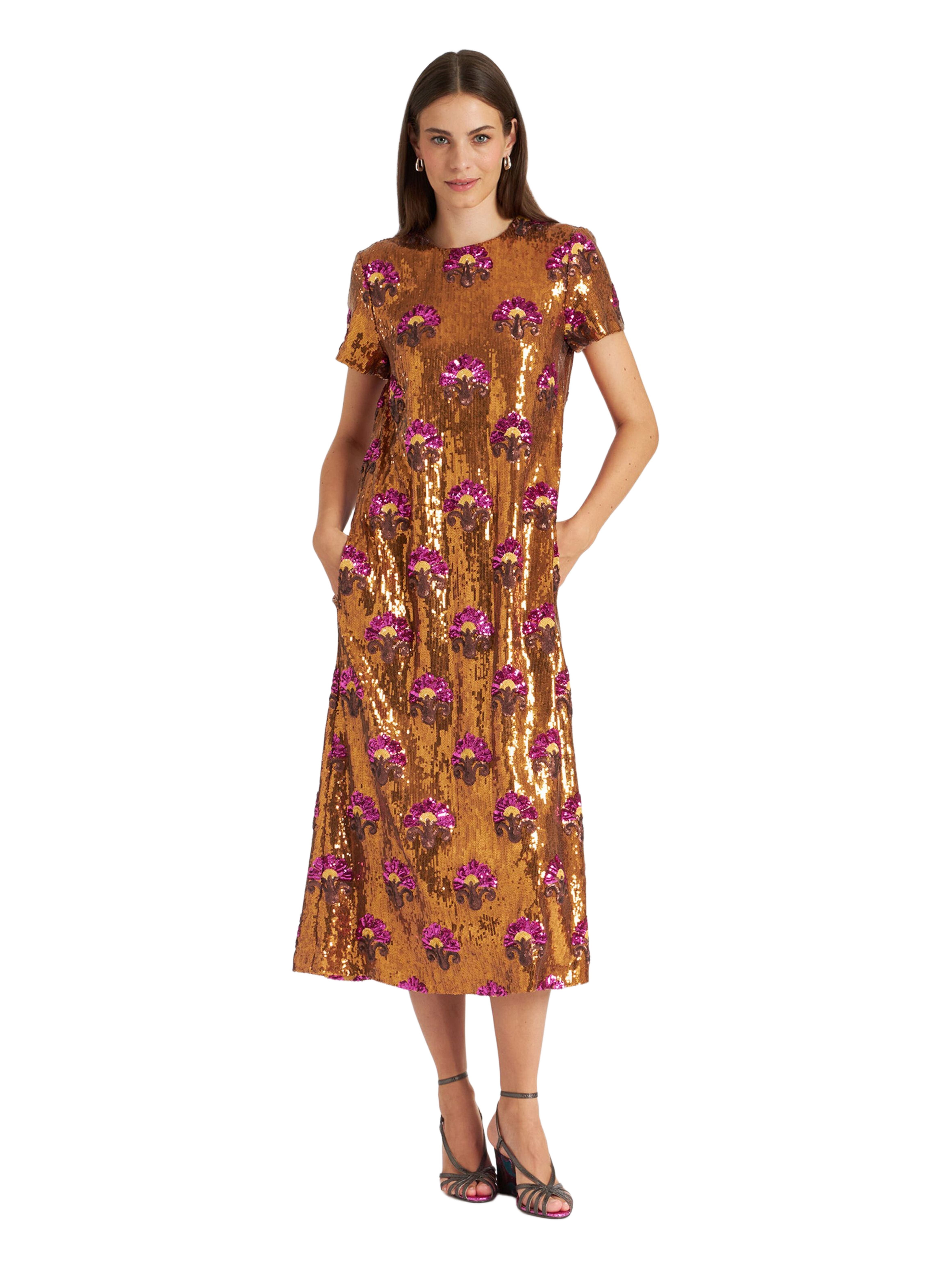There’s nothing quite like your first love. For us, that’s the Swing Dress, our first silhouette which we’ve reimagined in luxurious textiles and intricate embroideries for our new series of Super Swings! Same classic A-line shape, same slip shoulders, same effortless elegance… Just now with more structure, substance and sparkle for an elevated take on our best-selling dress. This beauty is indulgently strewn with hundreds of textured sequins for out and out glamour - no matter the scenario, there’s a Super Swing to help you shine. Textured paillettes Slim in the shoulders, generous in the hips Classic T-shirt silhouette Falls into an A-line Long maxi length Hidden side slit pockets Concealed back zipper 100% Made in Italy Composition: 99% Polyester 1% Elastane The model is 5'10" tall and wears a size S Garment length: 53.2"