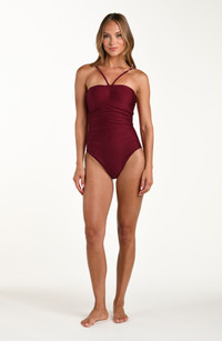 A ruched front details the front of this shimmering one-piece fashioned with removable straps and moderate back coverage. Sweetheart neck Convertible, removable straps Moderate back coverage Lined, with removable soft cups 80% nylon, 20% elastane Hand wash, line dry Imported