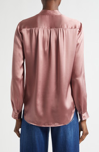 Subtle gathers at the cuffs, shoulders and back yoke give soft dimension to this luminous satin blouse designed with an eye on enduring style. 27" length (size Medium) Split neck Band collar Long sleeves with one-button cuffs 100% silk Dry clean Imported via C