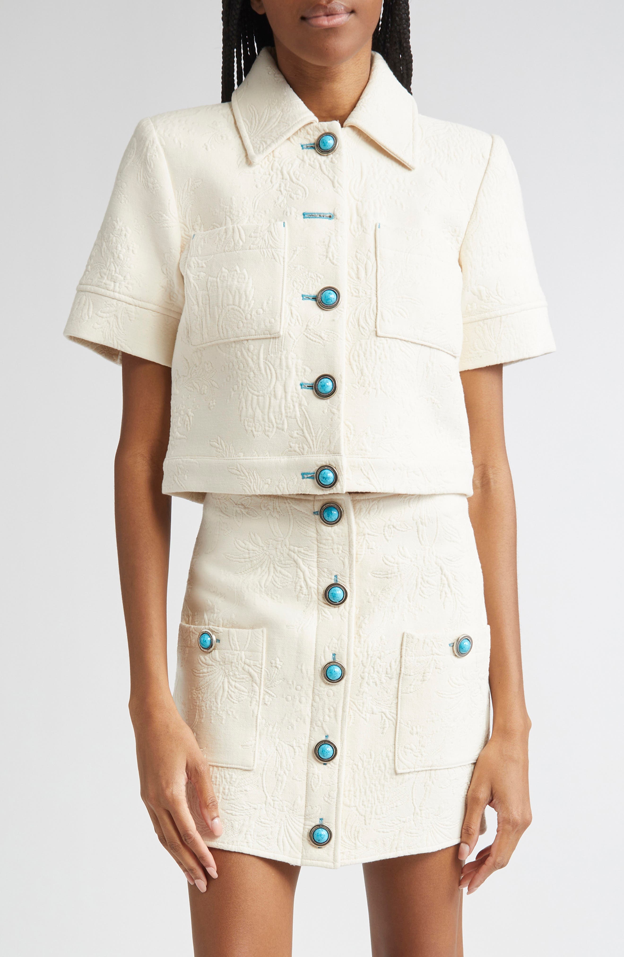 Contrasting buttons add the perfect pop of contemporary style to this tonal-jacquard jacket featuring short sleeves and a slightly cropped length. Front button closure Point collar Short sleeves Chest patch pockets Lined 100% cotton Dry clean Imported