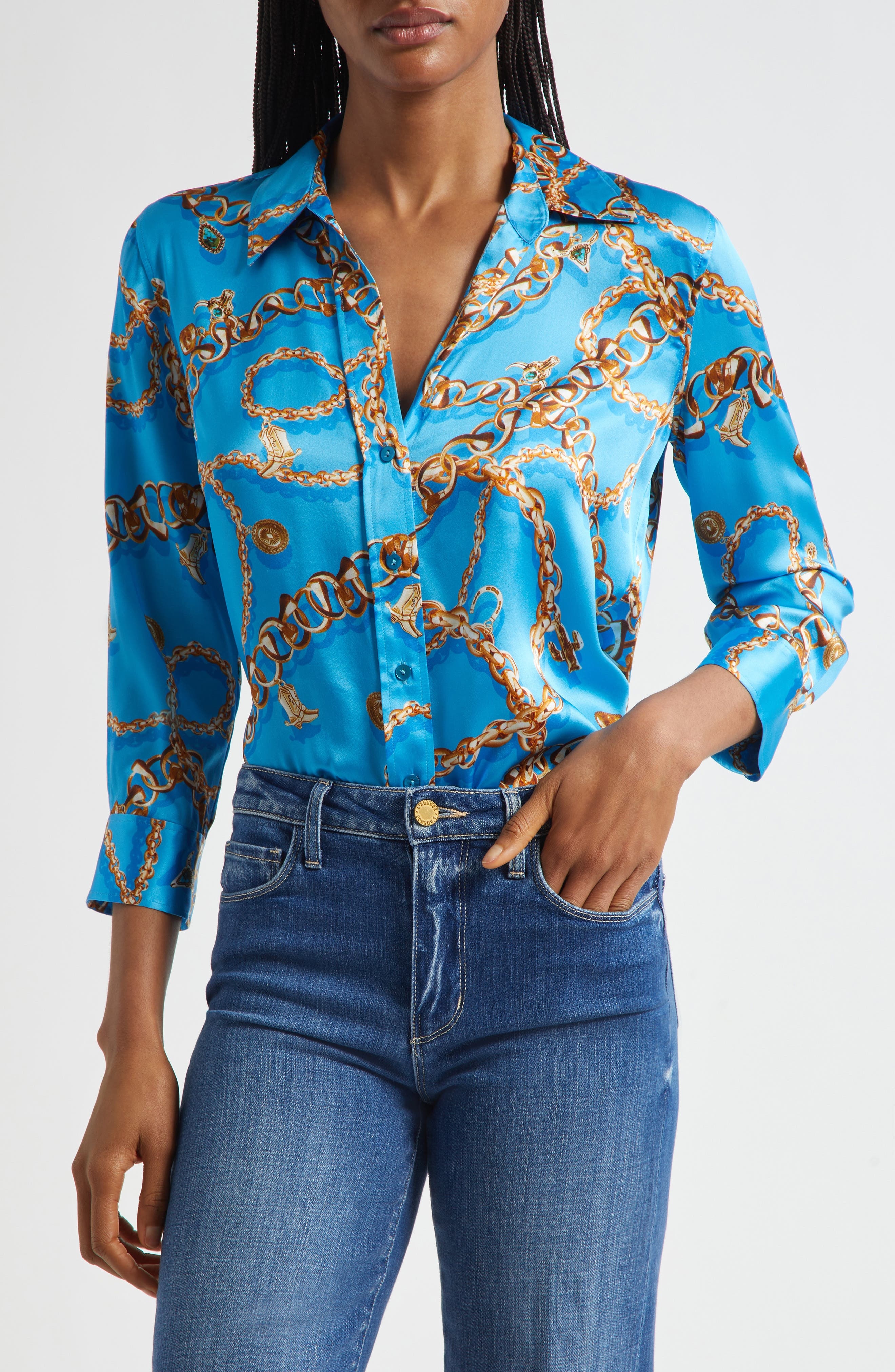 L'AGENCE Dani Chain Print Three-Quarter Sleeve Silk Button-Up Shirt in Dresden Blue/Gold Chain at No