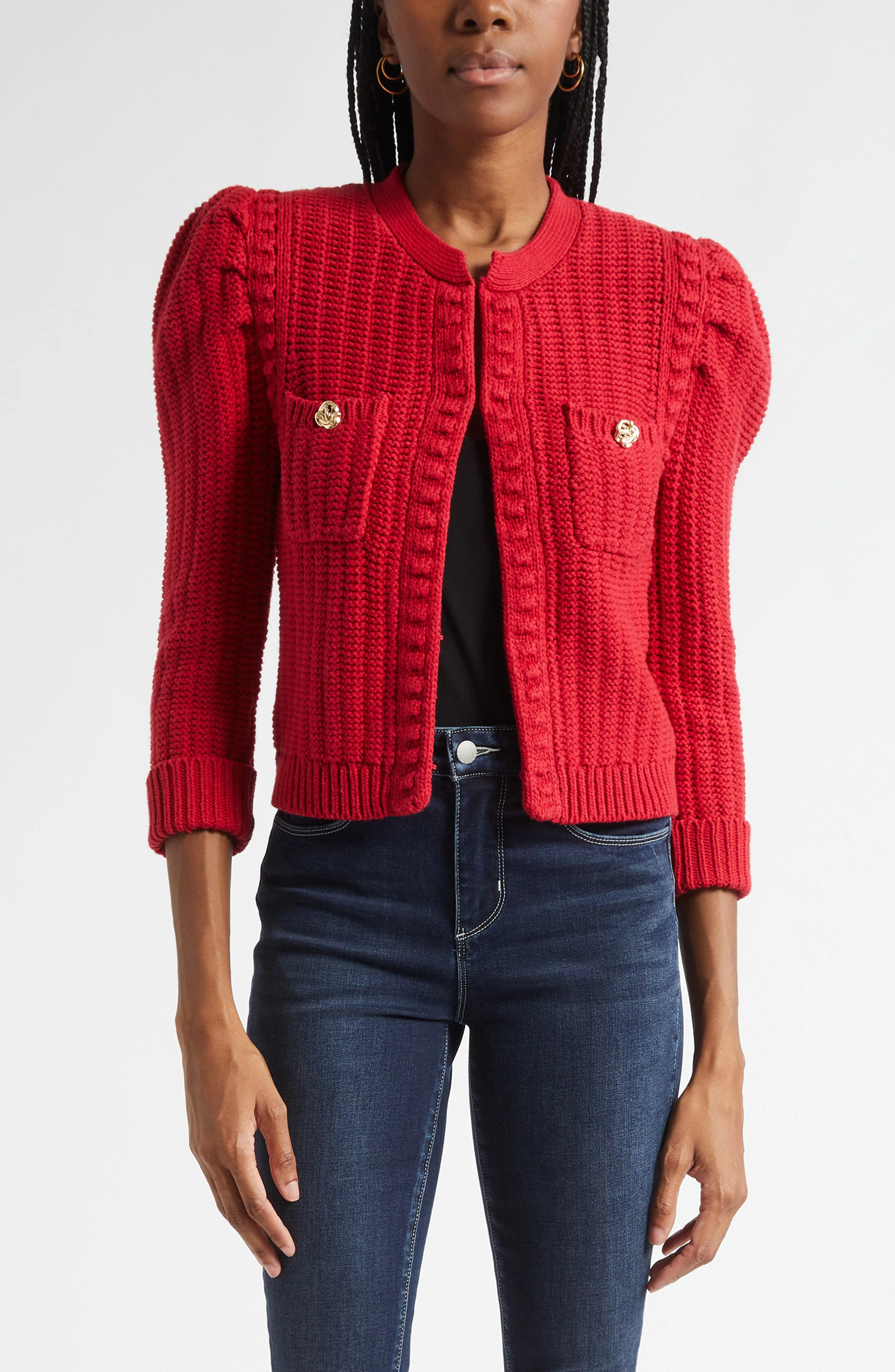 L'AGENCE Delli Juliet Sleeve Cotton Blend Cardigan in Engine Red/Gold at Nordstrom