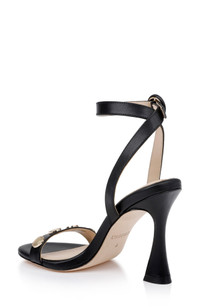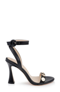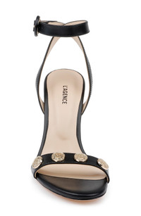 Complete your look with the bold glamour of this lofty ankle-strap sandal embellished with gleaming studs. 4" heel Adjustable ankle strap with buckle closure; hidden elastic inset Memory foam cushioning Leather upper, lining and sole Imported