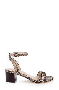 Snakeskin embossing makes a scintillating statement on a block-heel sandal complete with comfort-enhancing memory foam cushioning. 2" heel Adjustable ankle strap with buckle closure; hidden elastic inset Memory foam cushioning Leather upper, lining and sole Imported