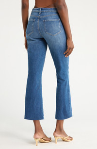 These kicky cropped jeans with a bit of stretch are turned to the perfect fade and finished with raw-edge hems. 26" inseam; 18" leg opening; 10 1/2" front rise; 14 1/2" back rise (size 29) Zip fly with button closure Five-pocket style 79% cotton, 20% REPREVE® recycled polyester, 1% spandex REPREVE recycled polyester is made from 100% post-consumer recycled plastic bottles Machine wash, line dry Made in the USA