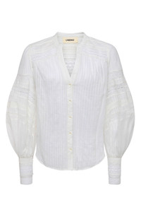 Airy lace insets charm this light and lovely button-up top designed with billowed sleeves and a curved shirttail hem. Front button closure V-neck Long sleeves with button cuffs 100% rayon Dry clean Imported