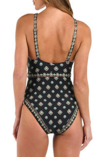 A Southwestern-inspired print and chunky, adjustable belt adorn a fanciful one-piece designed with a plunge neck and open back. Plunge neck Removable soft cups Lined 80% nylon, 20% elastane Hand wash, line dry Imported