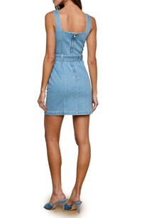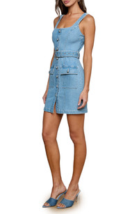 A defining belt cinches the silhouette of this stretch-kissed denim dress updated in a sleeveless silhouette and a leggy length. Exposed back-zip closure Front button closure Square neck Sleeveless Removable belt Front button-flap patch pockets 73% cotton, 26% lyocell, 1% elastane Machine wash, line dry Made in the USA