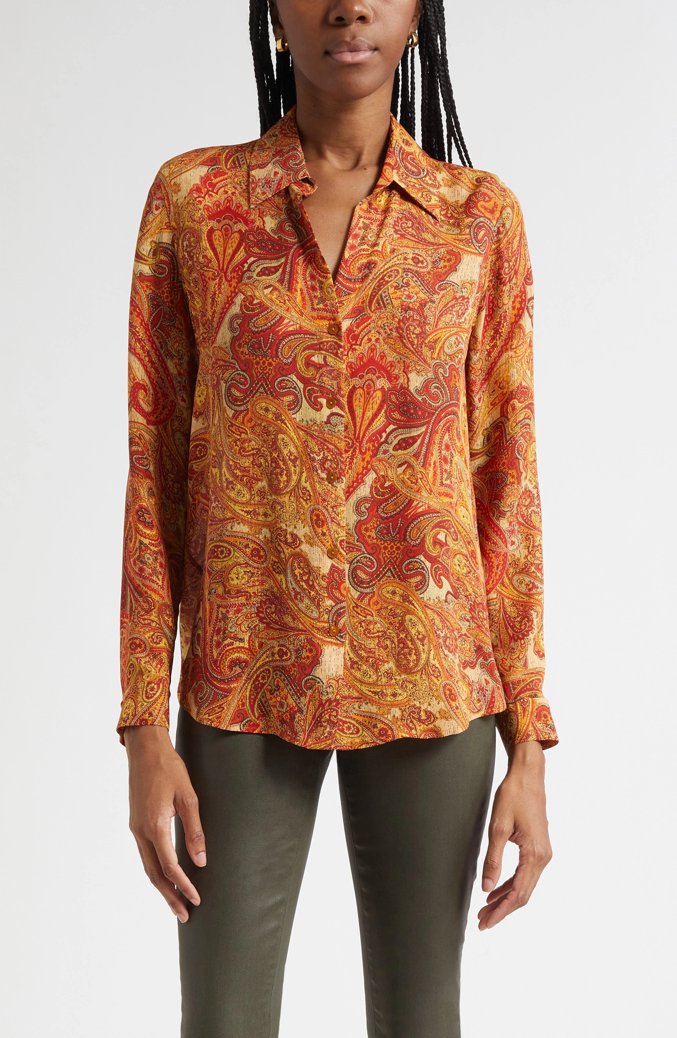 Swirling paisleys give a rich throwback look to a supple silk shirt that works for desk days and drinks dates. Front button closure Point collar Long sleeves with button cuffs 100% silk Dry clean Imported