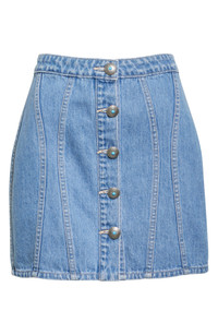 Wavy seams and turquoise-kissed buttons bring uniquely chic style to this nonstretch-denim miniskirt cast in a classic blue wash. Front button closure 100% cotton Hand wash, line dry Made in USA