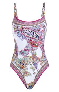Polished link hardware on the straps brings a hint of golden gleam to this one-piece swimsuit that gets extra support from shapely tricot fabric in a gorgeous print. Scoop neck Adjustable straps Moderate back coverage Lined, with removable soft cups 80% nylon, 20% elastane Hand wash, line dry Imported