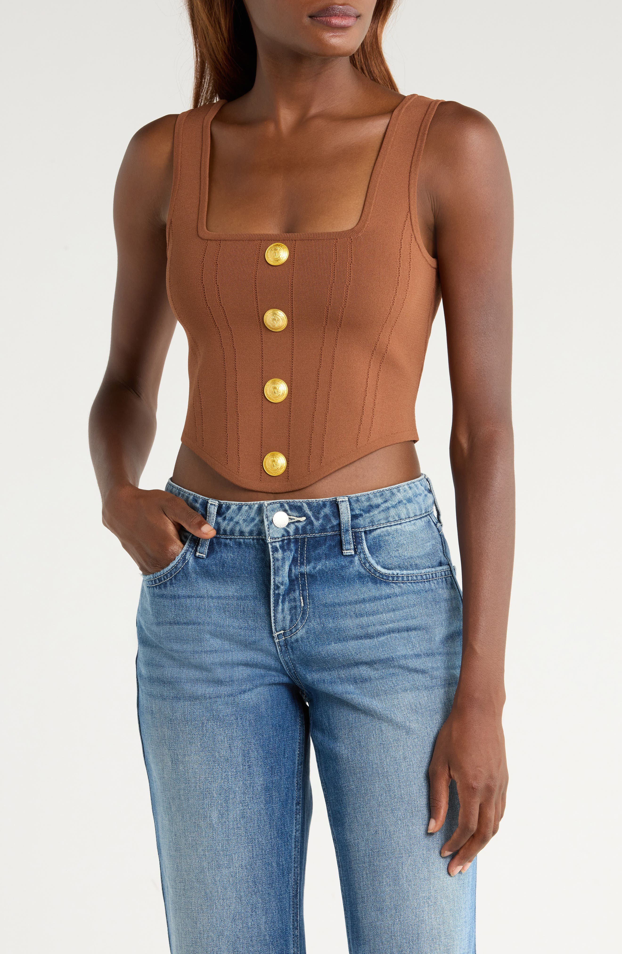 Brassy buttons polish an abbreviated knit-to-fit tank that shows a little skin. Square neck 55% rayon, 43% nylon, 2% spandex Dry clean Imported
