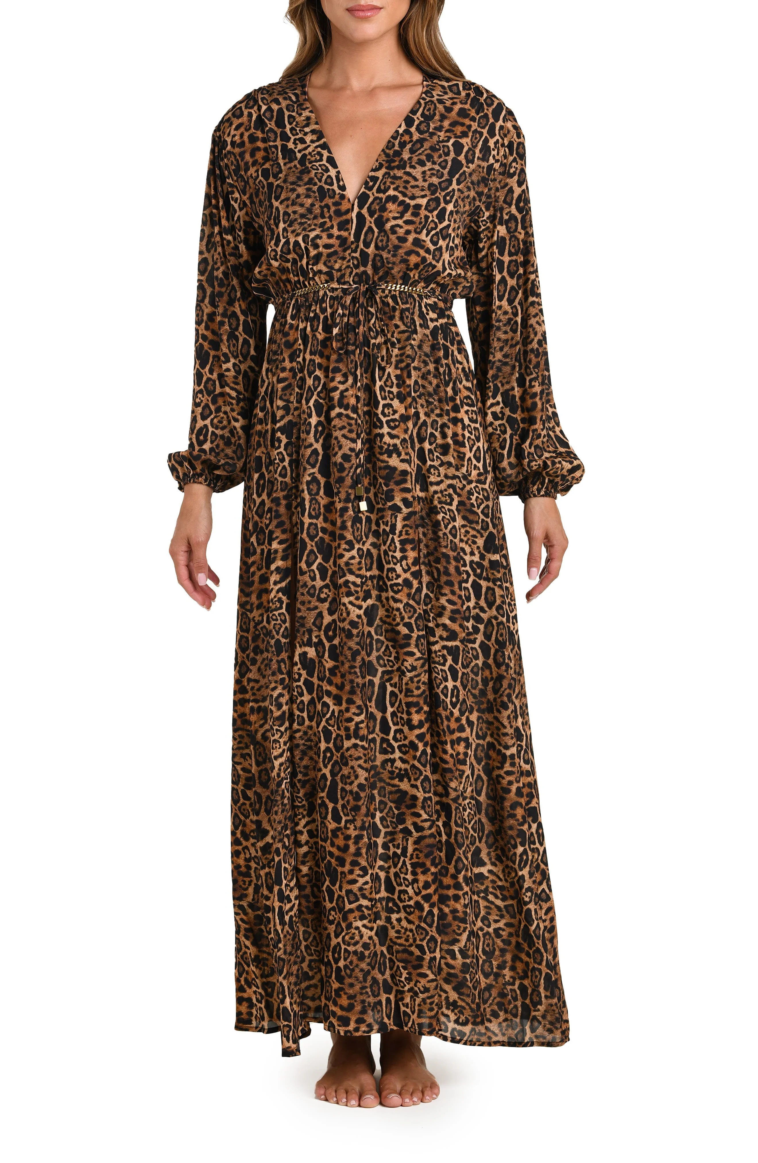 L'AGENCE Sara Leopard Print Long Sleeve Chiffon Cover-Up Maxi Dress in Natural at Nordstrom