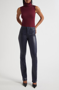 A flattering high waist and flared legs lend retro-inspired vibes to these shapely pants finished with a shiny coating. 34" inseam; 17 1/2" leg opening; 9 3/4" front rise; 14" back rise (size 29) Zip fly with button closure Five-pocket style 86% cotton, 11% elastane, 3% spandex Spot clean Made in the USA of imported fabric