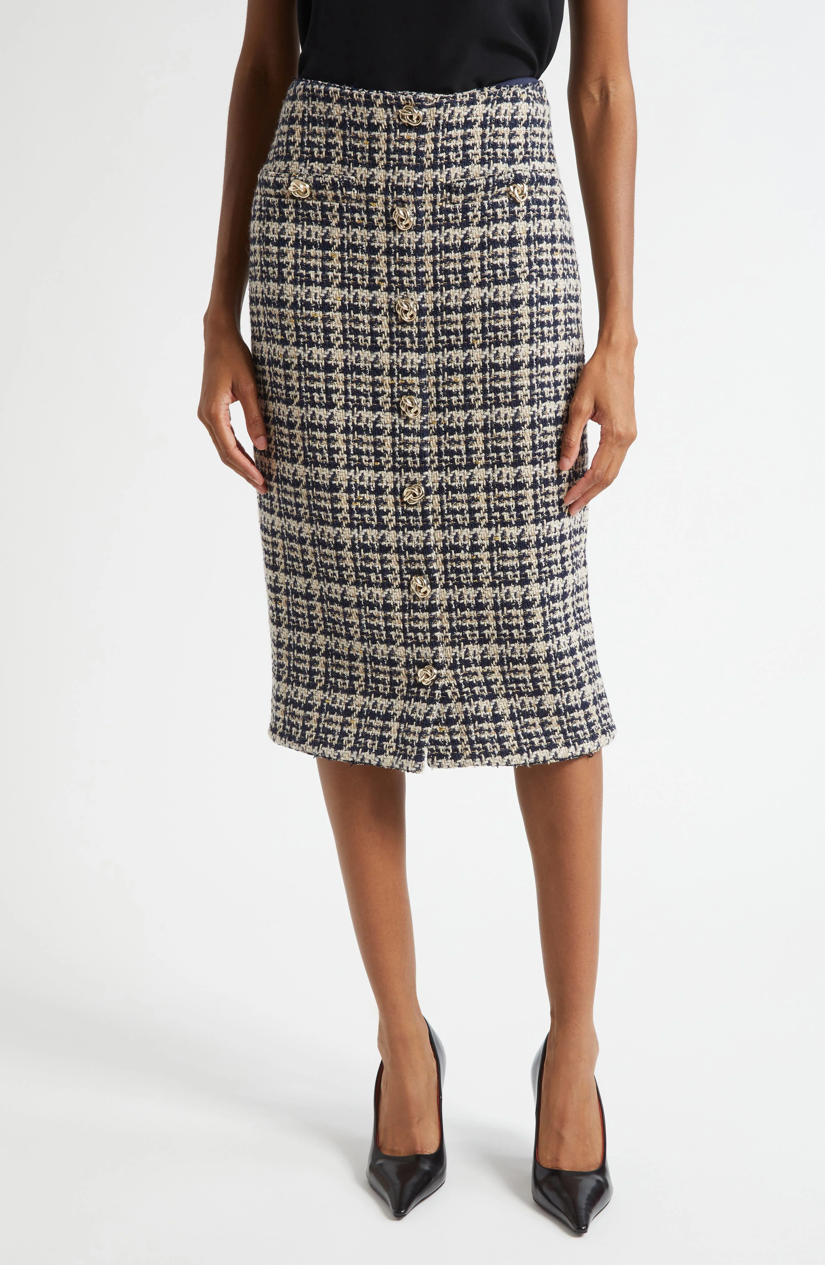 Take classic workday tweed beyond 9-to-5 in this figure-skimming midi skirt elevated with glossy goldtone buttons. Exposed back-zip closure Front welt pockets 57% cotton, 26% polyester, 9% acrylic Dry clean Made in Turkey