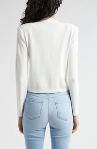 Ornate golden buttons adorn this close-fitting cardi trimmed with fine ribbing. 19" length (size Medium) Crewneck Long sleeves 80% rayon, 18% nylon, 2% spandex Dry clean Imported