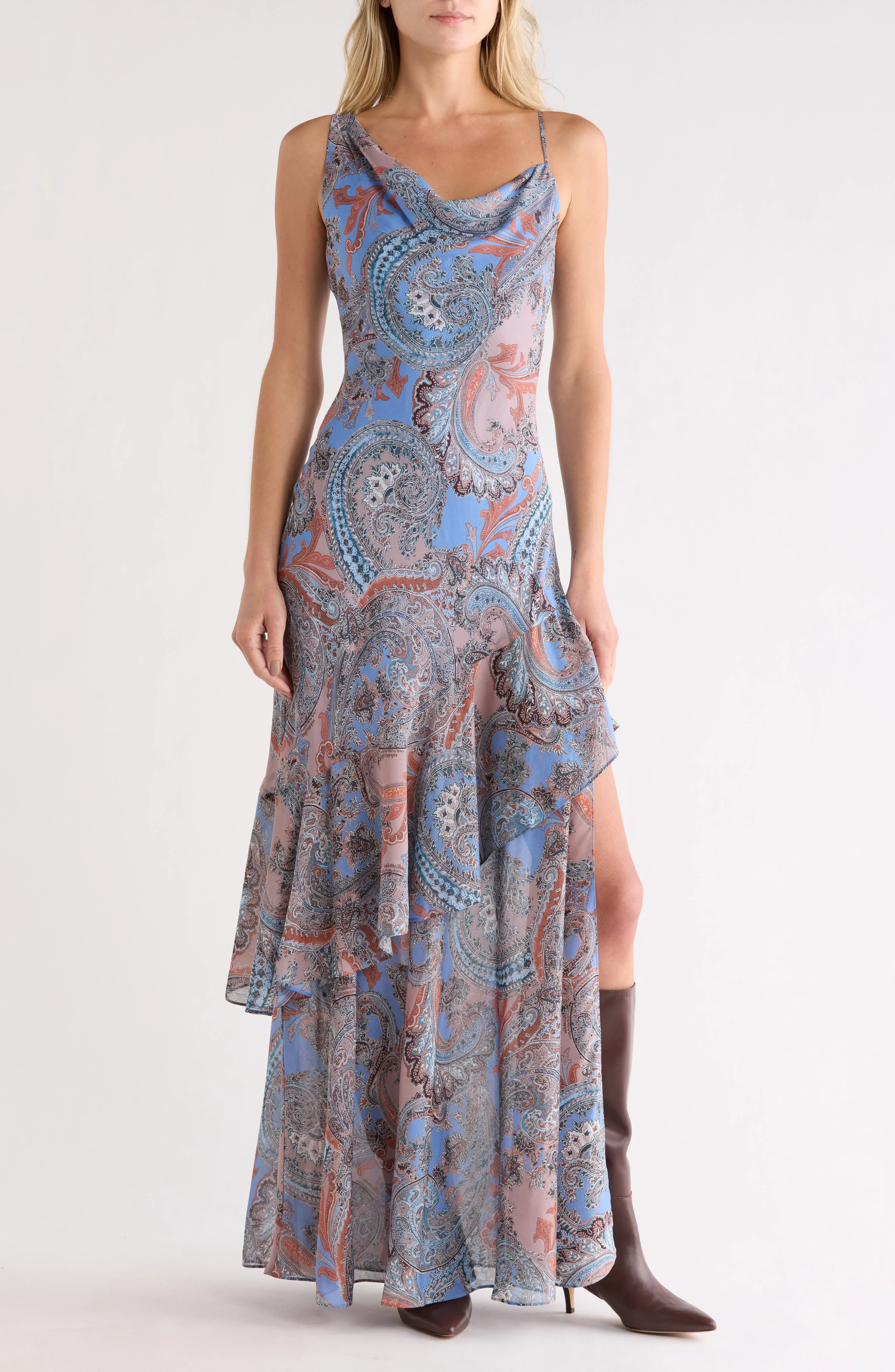 Pretty paisleys add artful elegance as they wind with the flow of this draped gown cut from luxe silk. Cowl neck Adjustable straps Side slit Lined 100% silk Dry clean Imported