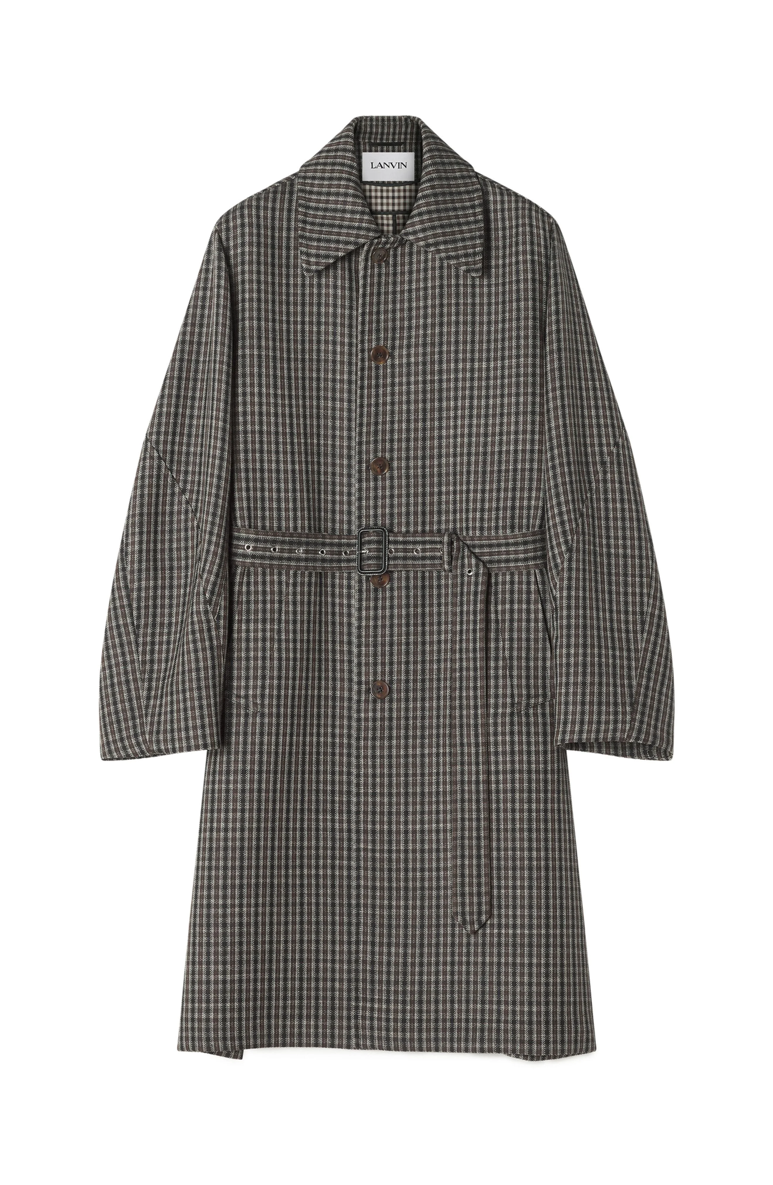 The design of this coat is inspired by the Car Coats of the 1920s, while the check pattern is reminiscent of the Maison's archives. Its proportions and volumes have been designed for comfort, style, and elegance. The densely woven wool ensures optimal wrinkle resistance. Car Coat In Compact Check Wool Loose Straight Fit Shirt Collar Removable Belt Single-Breasted Made In Italy